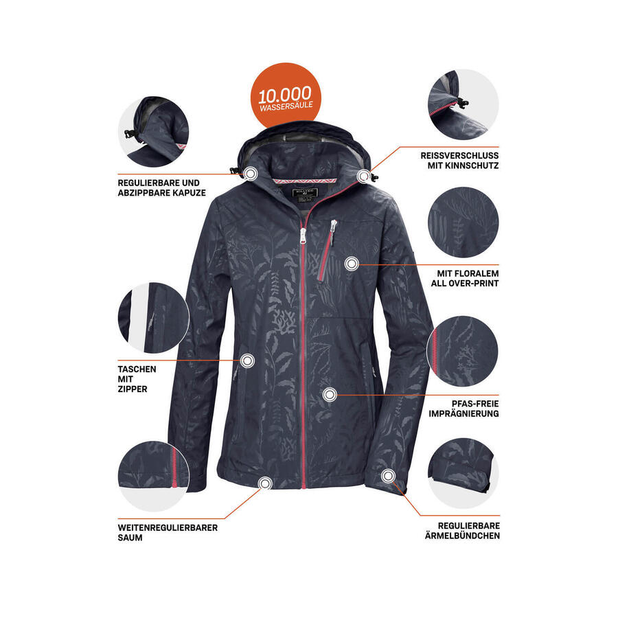 Женская куртка softshell killtec со специальным принтом по всей поверхности надежно сопроводит вас в межсезонье и прохладные летние дни. Водоотталкивающие свойства и ветронепроницаемость 10 000 мм водяного столба. В то же время она дышащая с паропроницаемостью 3000 г/м²/24 ч. Капюшон регулируется и отстегивается при необходимости. Подол регулируется шнурком, а манжеты регулируются застежкой-липучкой. Передняя молния оснащена защитой подбородка от защемления. Два боковых кармана и нагрудный карман застегиваются на молнии, чтобы ничего не потерялось. Killtec уделяет особое внимание экологичности своих коллекций и их перспективности. Поэтому killtec уделяет все больше внимания ответственным производственным процессам. Эта куртка обработана пропиткой без ПФАС и частично изготовлена из переработанного материала.