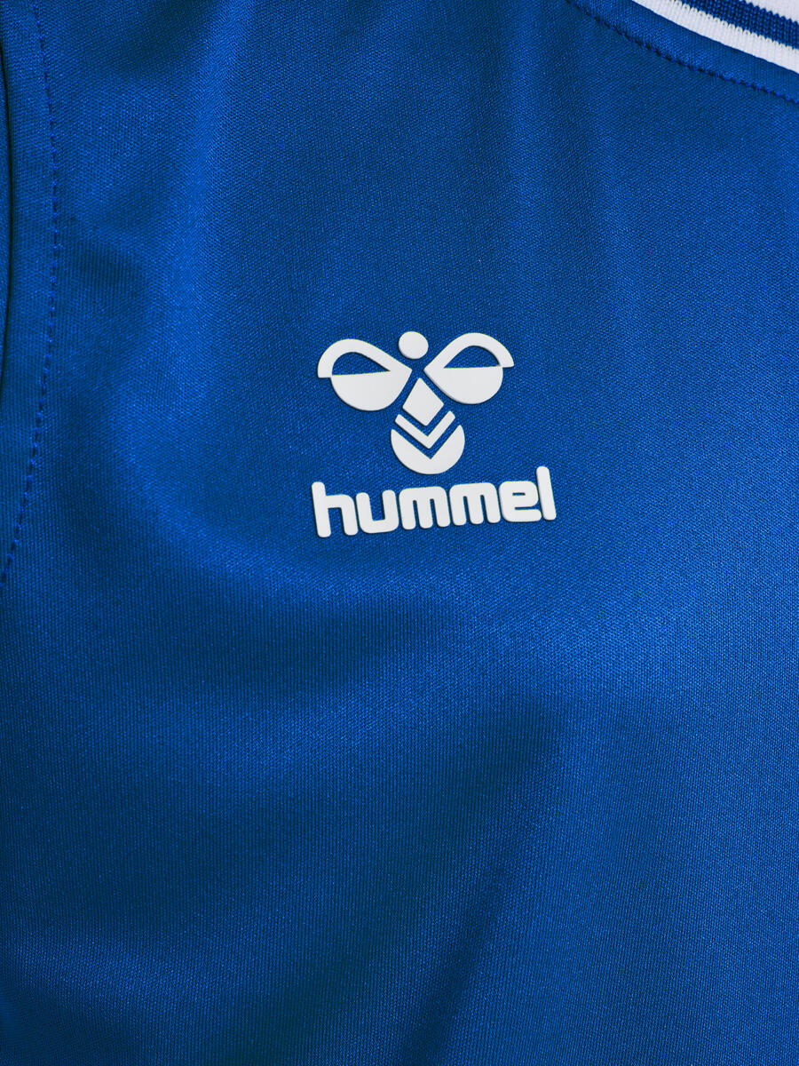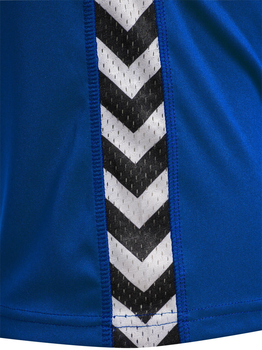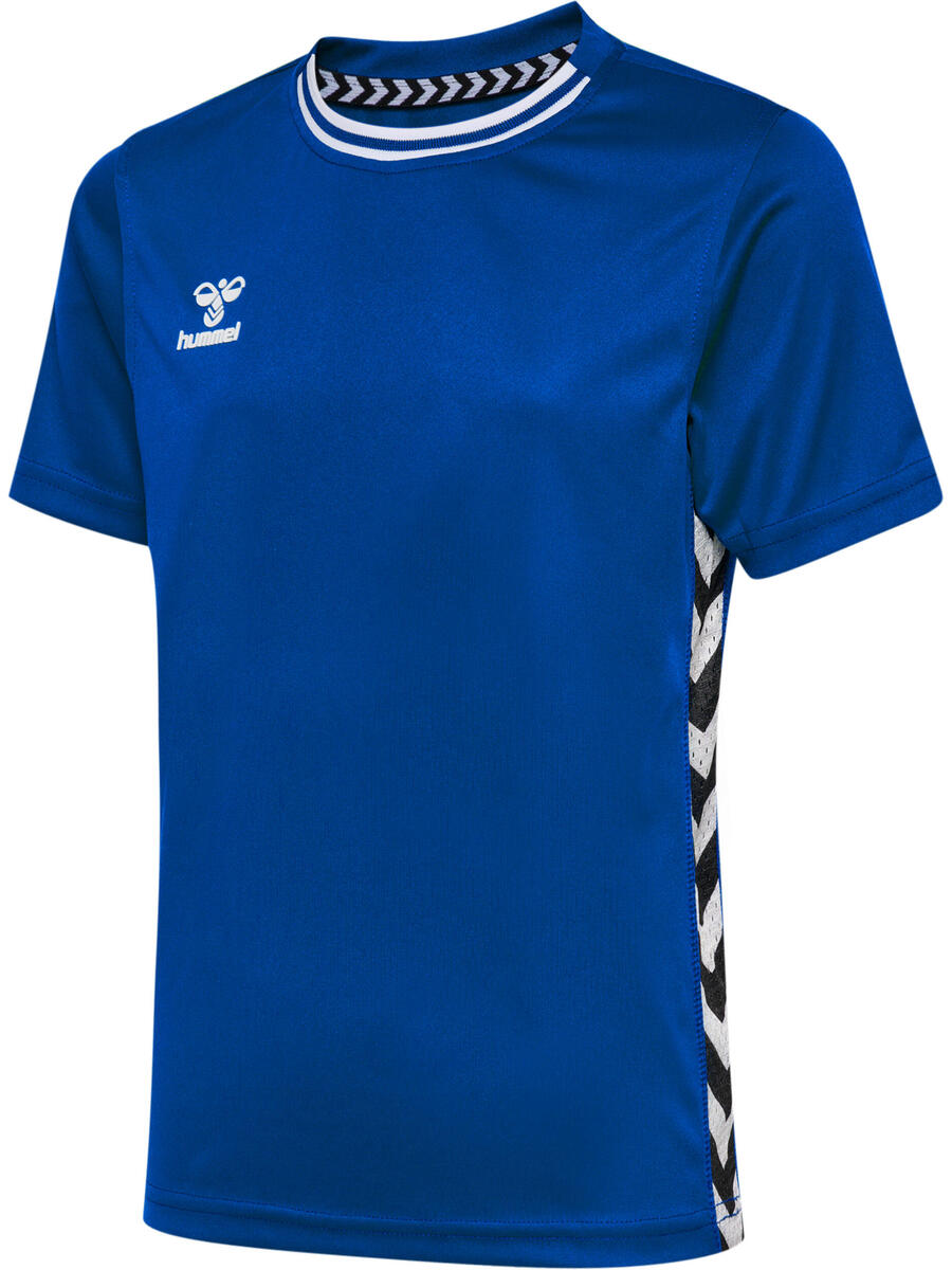 Эта тренировочная футболка изготовлена из лёгкого, дышащего материала и обеспечивает комфорт при каждом движении. Она имеет классический круглый вырез, полосатую резинку и фирменную шевронную ленту по бокам. На груди — логотип Hummel.