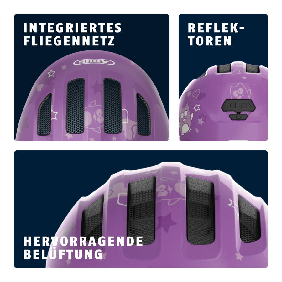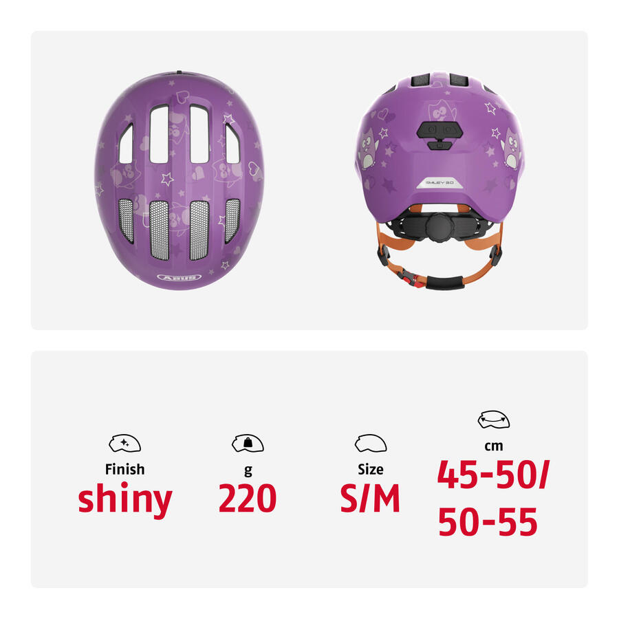 Детский велосипедный шлем ABUS Smiley 3.0 — больше защиты для самых маленькихПодобно тому, как дети понемногу развиваются каждый день, так же развивается и популярный детский шлем Smiley от ABUS. Благодаря полностью переработанной внешней форме, адаптированным функциям и великолепному дизайну, он является востребованным защитой головы для начинающих велосипедистов. Будь то в прицепе, на родительском велосипедном кресле, на трехколесном велосипеде или на вашем первом беговеле, Smiley 3.0 всегда будет надежным спутником. Этот велосипедный шлем для детей от 1 года обеспечивает хорошую всестороннюю защиту. Глубокая посадка и, в частности, передний край защищают голову и лицо ребенка. Система регулировки высоты позволяет легко отрегулировать шлем по окружности головы — как по ширине, так и по высоте на затылке. Еще одно преимущество системы регулировки высоты — для детей с длинными волосами. Он оставляет место для конского хвоста. Это устраняет раздражающее давление регулировочного колеса на конский хвост. Комфорт при ношении также повышается за счет толстой подбородочной накладки. Блестящие шлемы доступны как с детскими рисунками, так и в однотонных цветах. Благодаря этому выбору каждый мальчик и девочка найдут себе шлем, который им понравится. Другие преимущества продукта: In-Mold: производственный процесс создает прочное соединение между внешней оболочкой и амортизирующим жестким пеноматериалом (EPS). Zoom Ace Kids: регулируемая по высоте система, позволяющая индивидуально подогнать размер. Вентиляция: 4 входных и 4 выходных отверстия для воздуха для предотвращения перегрева. Съемная и моющаяся подкладка для комфорта при ношении. Встроенные москитные сетки для защиты от насекомых. Пассивная безопасность со светоотражателями.