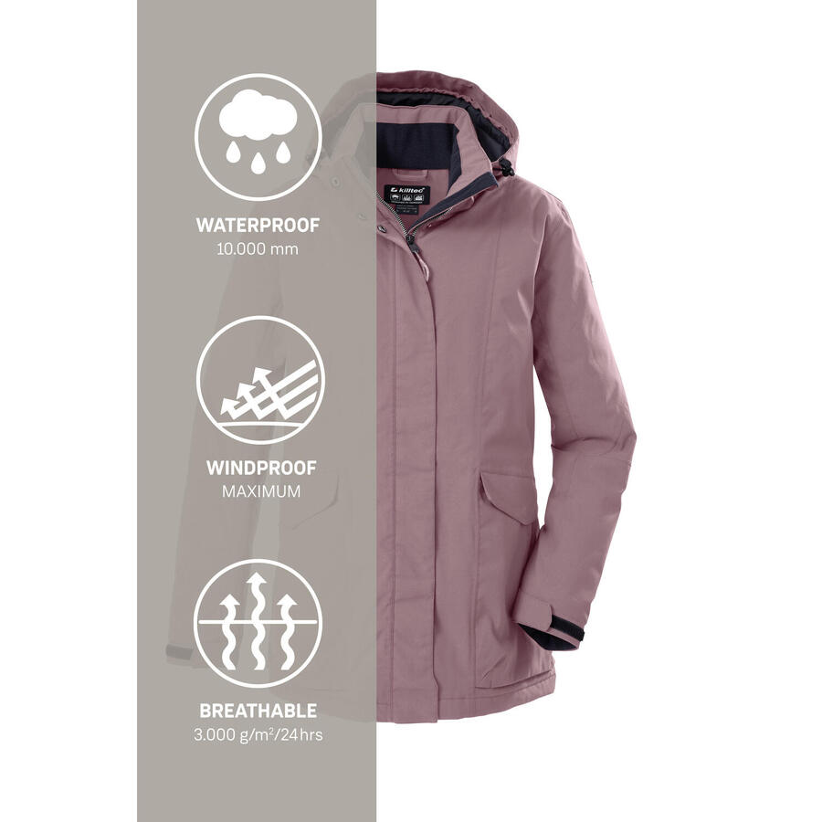 Женская функциональная куртка со съемным капюшоном, водонепроницаемая (10 000 мм), сварными швами, дышащая (3000 г) и ветрозащитная, со скрытой двухсторонней молнией и пятью застегивающимися карманами. Название: Женская куртка. Сезон: Осень/Зима. Эта женская функциональная куртка от killtec — идеальный универсальный вариант для холодного времени года. Она водонепроницаема (водонепроницаемость 10 000 мм), ветроустойчива и дышащая (3000 г/м²/24 ч). Скрытая двухсторонняя молния обеспечивает свободу движений, несмотря на удлиненный крой. Молния также оснащена защитой подбородка, предотвращающей защемление кожи. Функциональная куртка также имеет регулируемый капюшон, который можно снять при необходимости. Четыре боковых кармана застегиваются на кнопки и молнии, а внутренний карман обеспечивает дополнительное место для хранения. Killtec особенно стремится сделать свои коллекции более экологичными и перспективными. По этой причине killtec уделяет всё больше внимания более ответственным производственным процессам. Поэтому эта куртка обработана пропиткой без ПФАС.