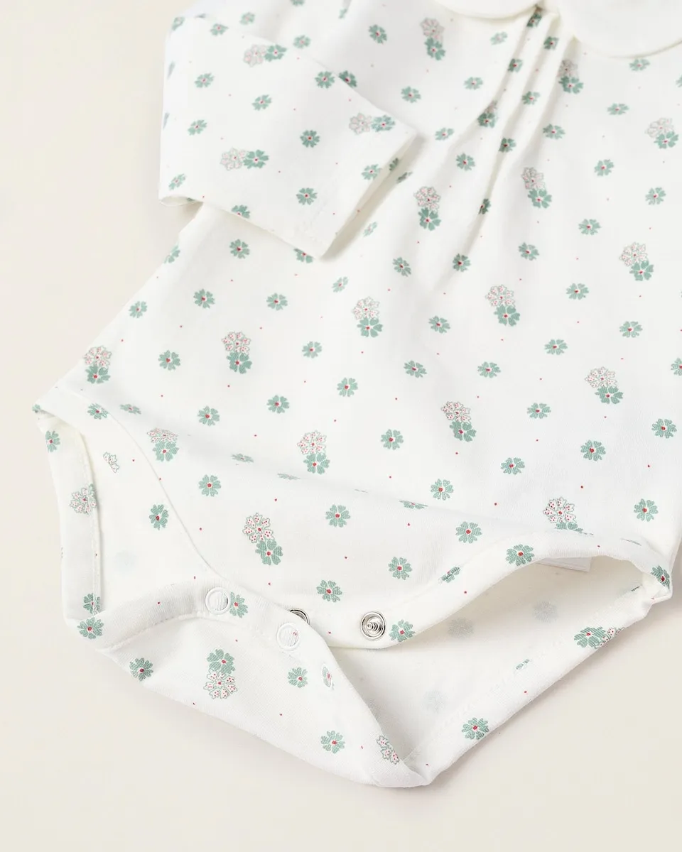 Белое боди с цветочным узором в зеленых и красных тонах для новорожденной. Воротник Питер Пэн. Кнопки на спине и между ног для легкого одевания. Внутренняя этикетка с принтом, чтобы не раздражать кожу. Мягкое, удобное и нежное!