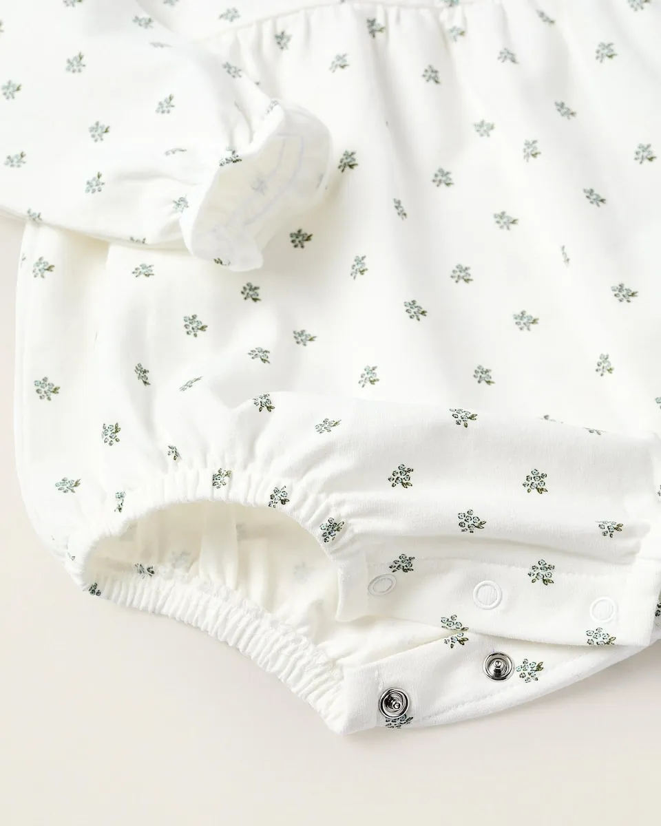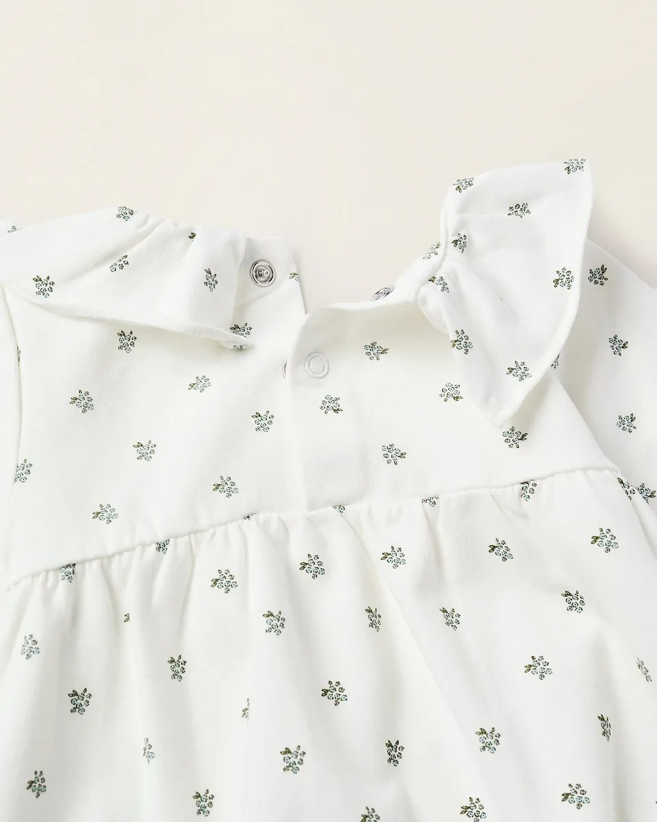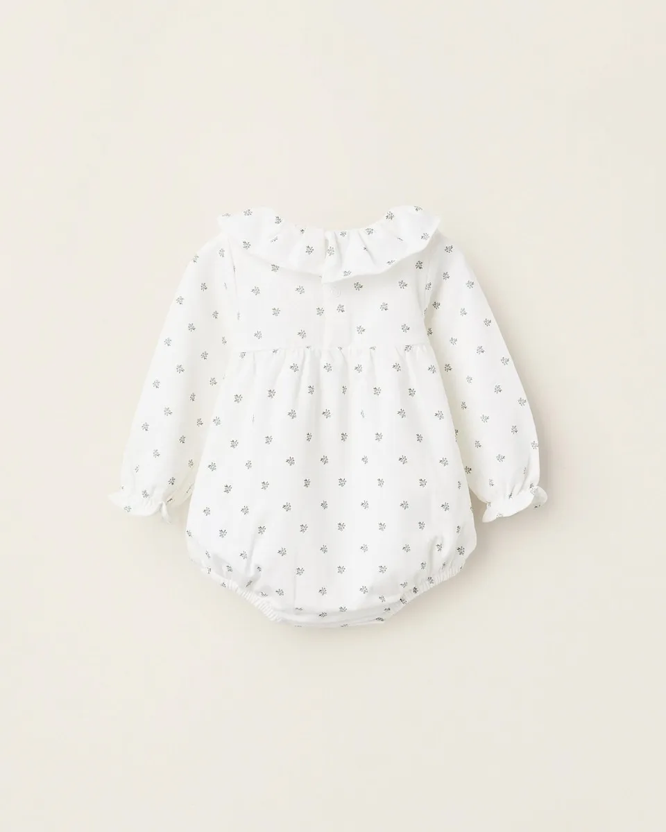 Белое боди с длинным рукавом для новорожденной, выполненное из хлопка с небольшой эластичностью для большего комфорта и свободы движений. Цветочный узор в зеленых и синих тонах. Рюши на воротнике и манжетах. Кнопки на спине и в области промежности для легкого одевания. Внутренняя печатная этикетка, не раздражающая кожу. Прекрасный вариант, легко сочетается с другими вещами!