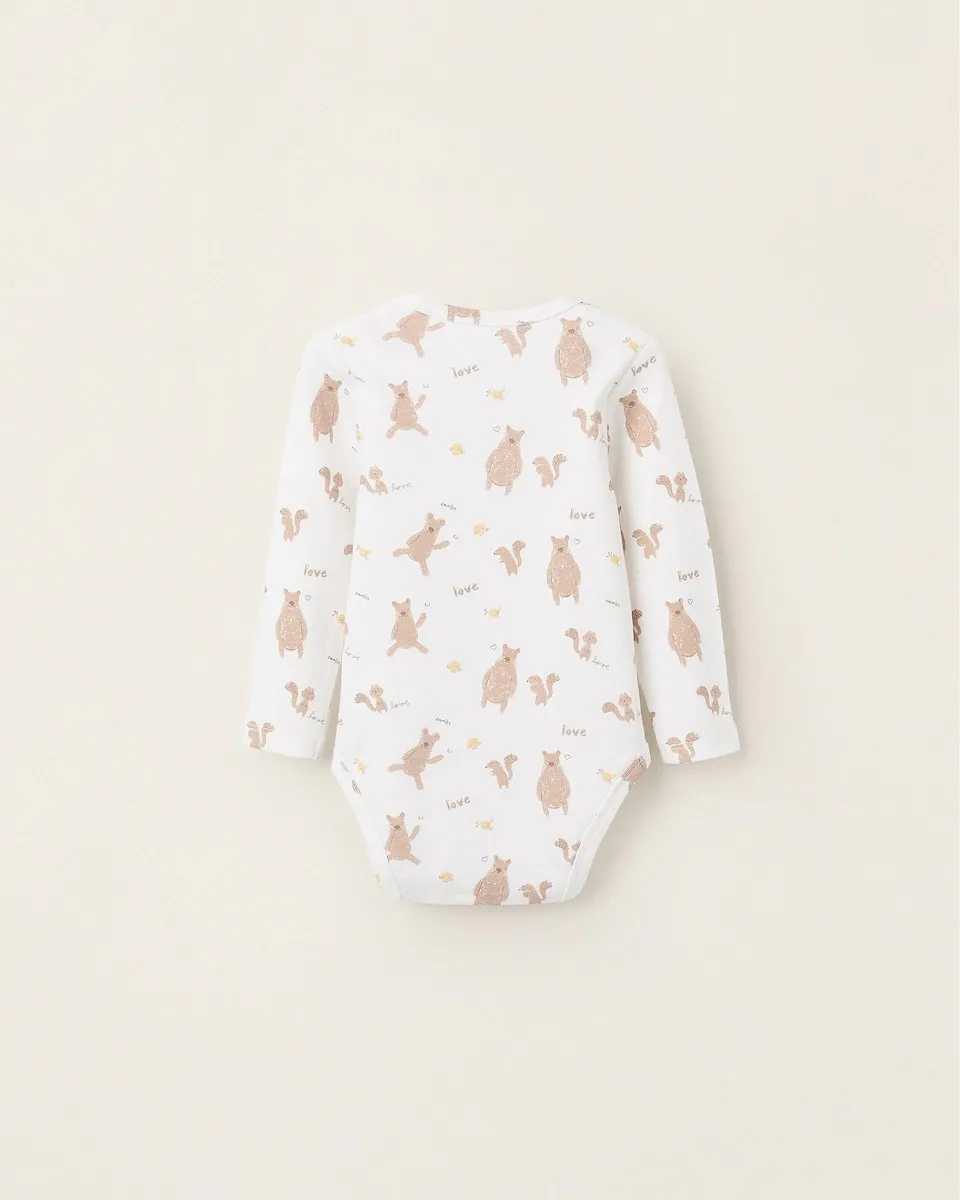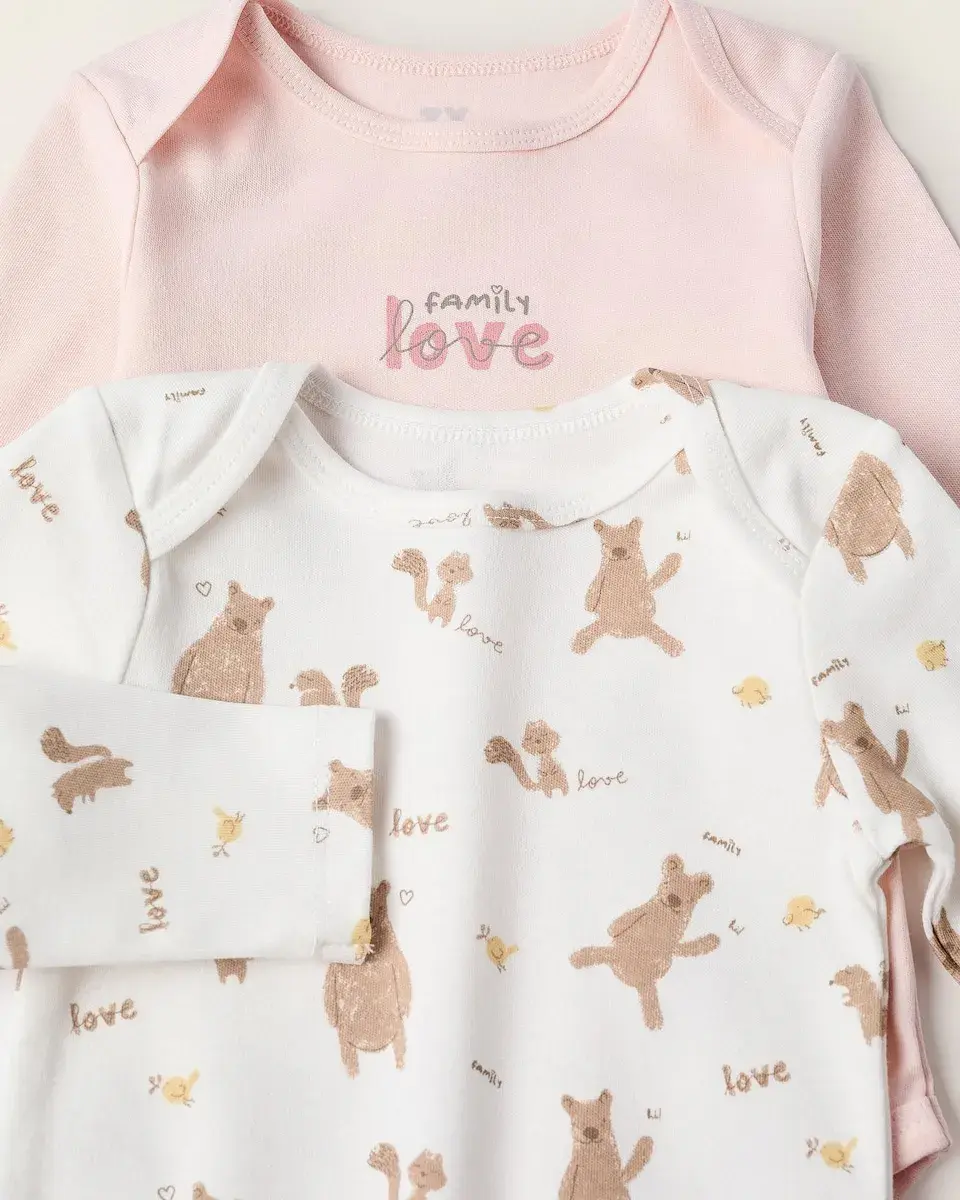 Набор из двух боди для девочки, 100% хлопок. Включает розовое боди с принтом на передней части и белое боди с изображениями медвежат, белочек и птичек. Перекрещивающиеся плечи для легкости одевания. Внутренние этикетки с печатью, чтобы не раздражать кожу. Мягкий и удобный комплект белья, идеально подходящий для повседневного использования!