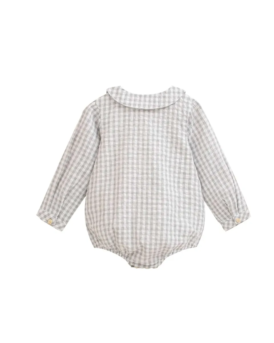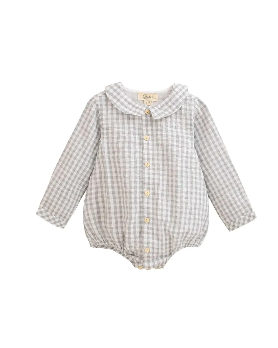 Малышовый комбинезон для мальчика в клетку виши, с длинными рукавами, круглым вырезом и застежкой спереди на деревянных пуговицах, милый и удобный.