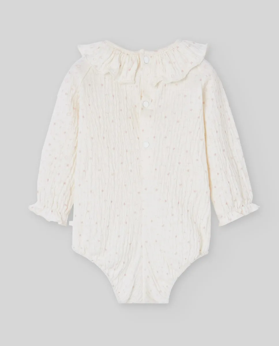 Бодик из хлопковой муслиновой ткани с принтом маленьких розовых звездочек. Воротник с рюшами и застежка сзади на пуговице. Застежка на пуговицы в области шагового шва облегчает смену подгузника. Идеально подходит для нежных и удобных образов.