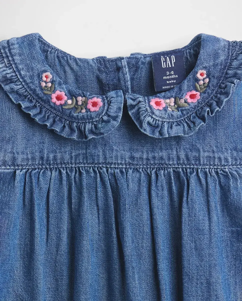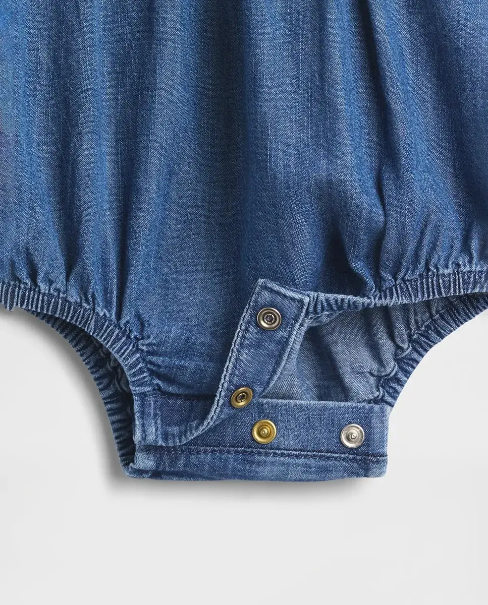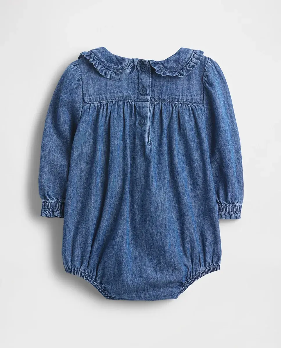 Настоящий джинсовый комбинезон без эластичности. Воротник Питер Пэн с воланами и вышитым узором спереди. Планка с пуговицами на спинке. Длинные пышные рукава с эластичными воланами на манжетах. Складки на шве кокетки. Кнопки на внутреннем шве для удобного одевания и смены подгузника. Темная стирка. Сделано ответственно: Этот джинсовый комбинезон является частью нашей программы Washwell, которая экономит воду. По сравнению с обычными методами стирки, Washwell использует как минимум на 20% меньше воды.