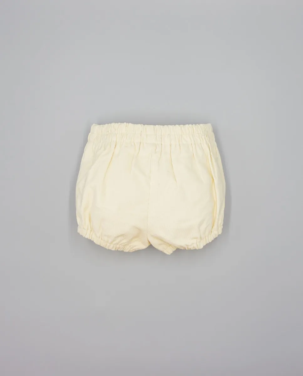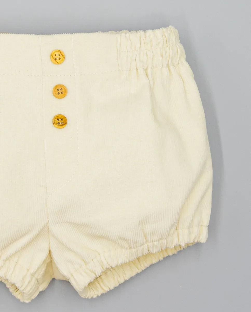 Бермуды бежевого цвета из вельвета с деревянными пуговицами. Талия на резинке для лучшей посадки, а резинка на ногах обеспечивает комфорт. Изготовлены из 100% хлопка, мягкие и теплые. Доступны в размерах от 3 месяцев до 4 лет.