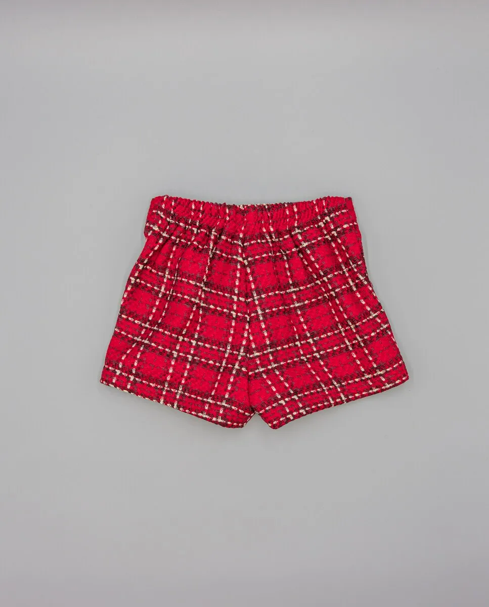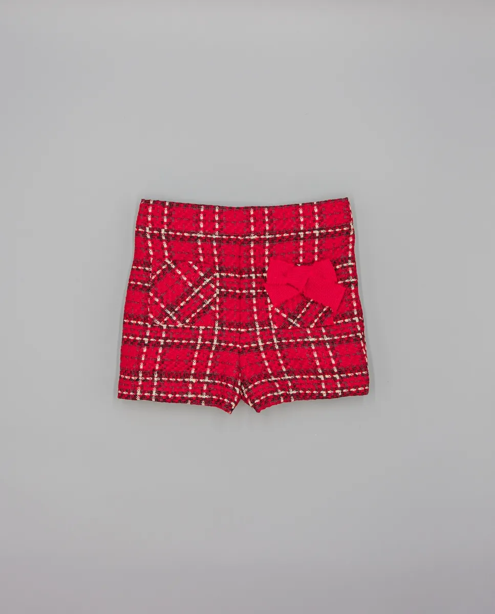 Красные шорты из фактурной ткани с бордово-бежевой клеткой для девочки. Карманы накладные, один с бантом из ткани отаман моарэ. Пояс на резинке для большего комфорта. Доступны размеры от 2 до 16 лет.