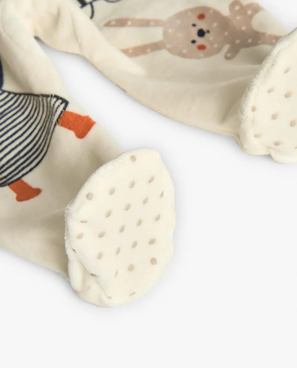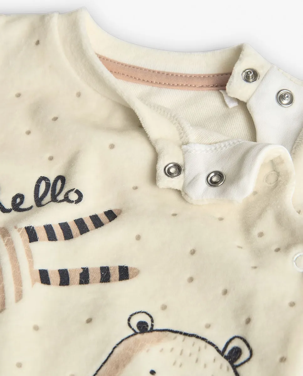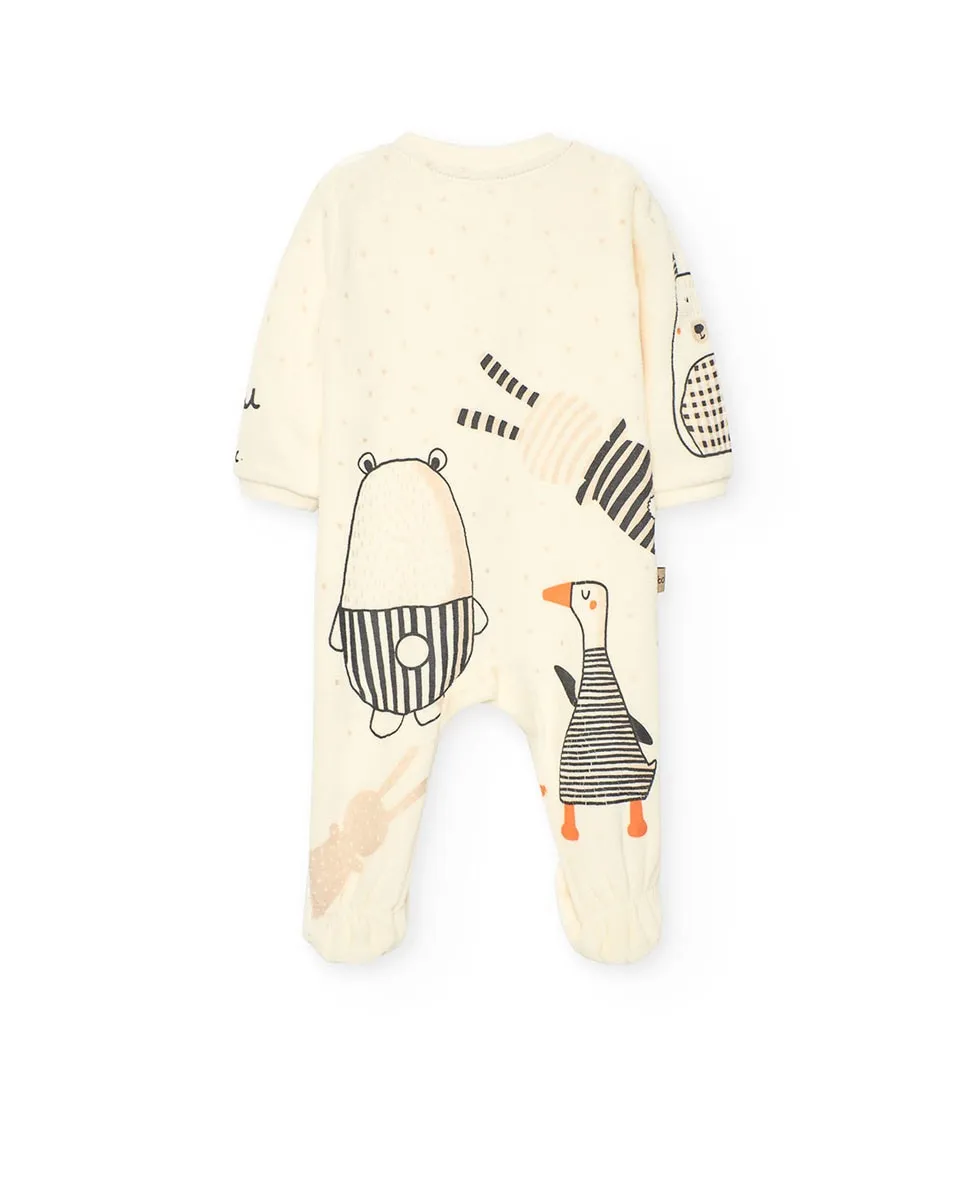Этот комбинезон для младенцев имеет очаровательный принт с животными в мягких тонах, идеально подходящий для первых месяцев. Изготовлен из мягкого флисового материала, обеспечивающего комфорт и тепло. Он разработан с длинными рукавами и встроенными ножками, что отлично подходит для того, чтобы малыш был в тепле. Дизайн доступен в размерах от 0 месяцев до 2 лет. Кремовая основа добавляет нежный штрих, а веселый стиль идеален для повседневного использования. Практичный и милый комбинезон для самых маленьких.