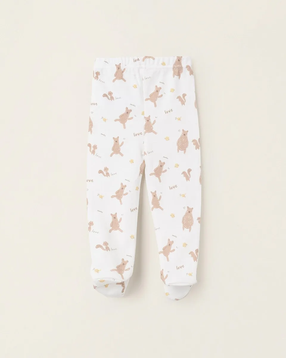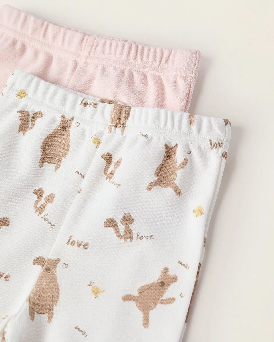 Набор из двух штанишек с закрытыми ножками для девочки, 100% хлопок. Включает одно розовое однотонное изделие и одно белое с мотивами медвежат, белочек и птичек. Эластичный и удобный пояс. Внутренние этикетки нанесены печатью, чтобы не раздражать кожу. Мягкий и удобный комплект одежды, идеально подходит для повседневного ношения!