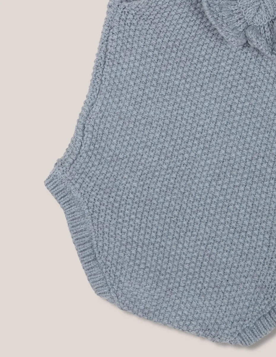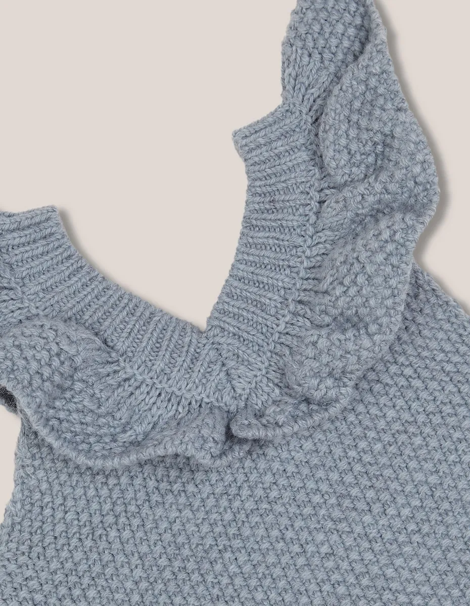 Вязаный комбинезоник с узором «рисовая вязка», с V-образным вырезом и оборками на бретелях в конце выреза.