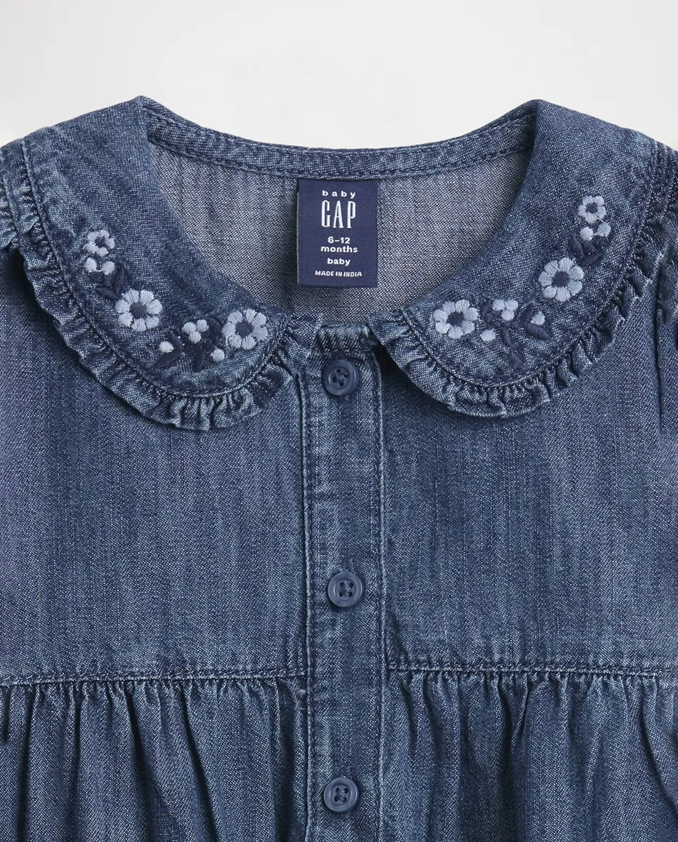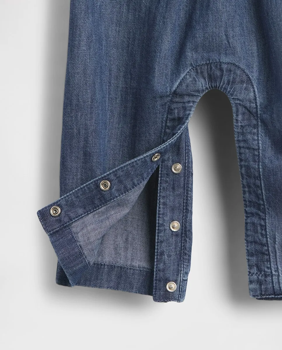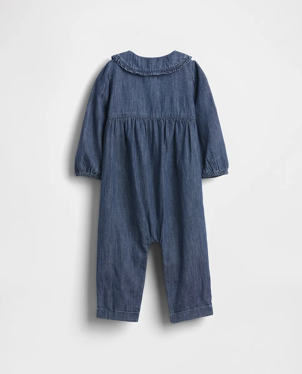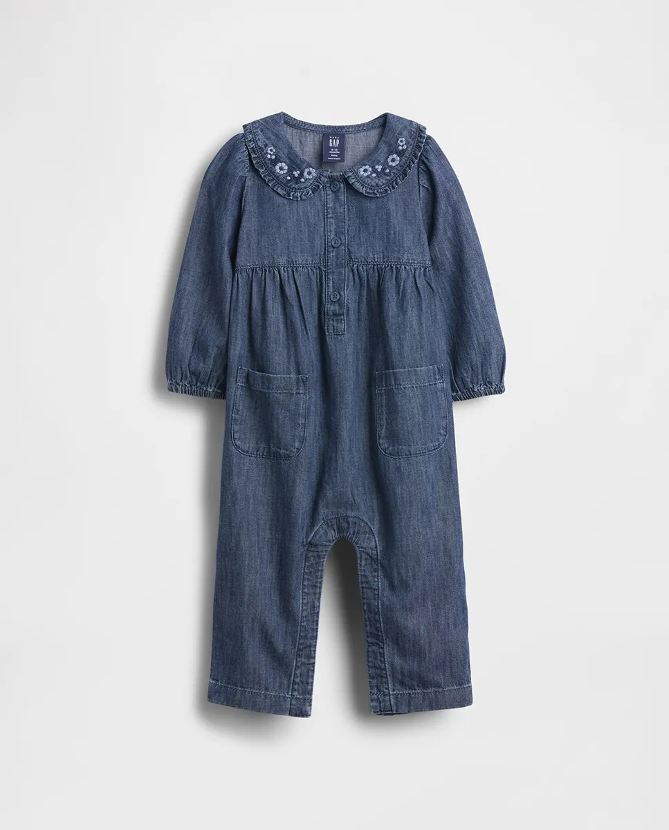 Мягкий джинсовый комбинезон. Круглый воротник, планка с пуговицами спереди. Воротник Питер Пэн с оборками и вышитым цветочным узором. Длинные рукава с эластичными манжетами. Лопаточные карманы спереди. Кнопки в шаговом шве для легкого надевания и смены подгузников. Средне-индиговая стирка. Сделано ответственно: Этот детский комбинезон является частью нашей программы Washwell, которая экономит воду. По сравнению с обычными методами стирки, Washwell использует как минимум на 20% меньше воды.
