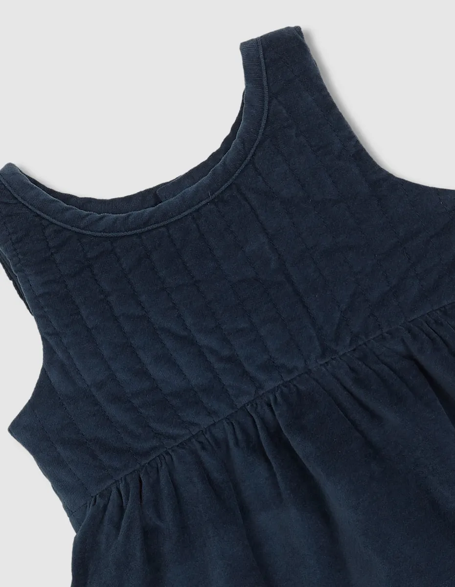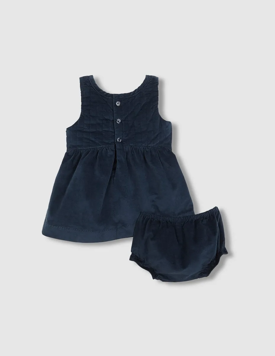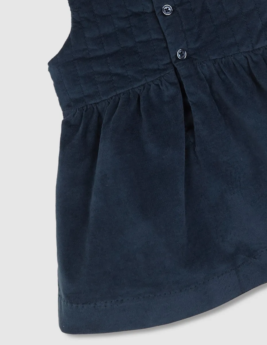 Вельветовое платье-пичи с планками, расположенными по верхней части, и с юбкой, свободно ниспадающей и слегка собранной на бедрах.