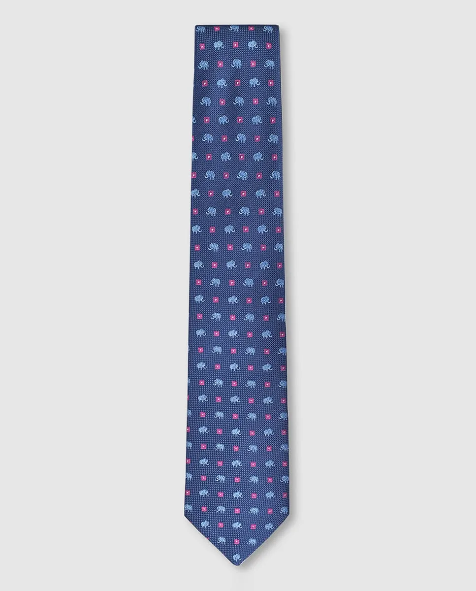 Элегантный галстук, сделанный вручную из 100% натурального шелка жаккард с узором из маленьких голубых слонов на темно-синем фоне.