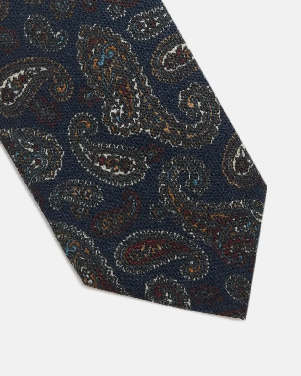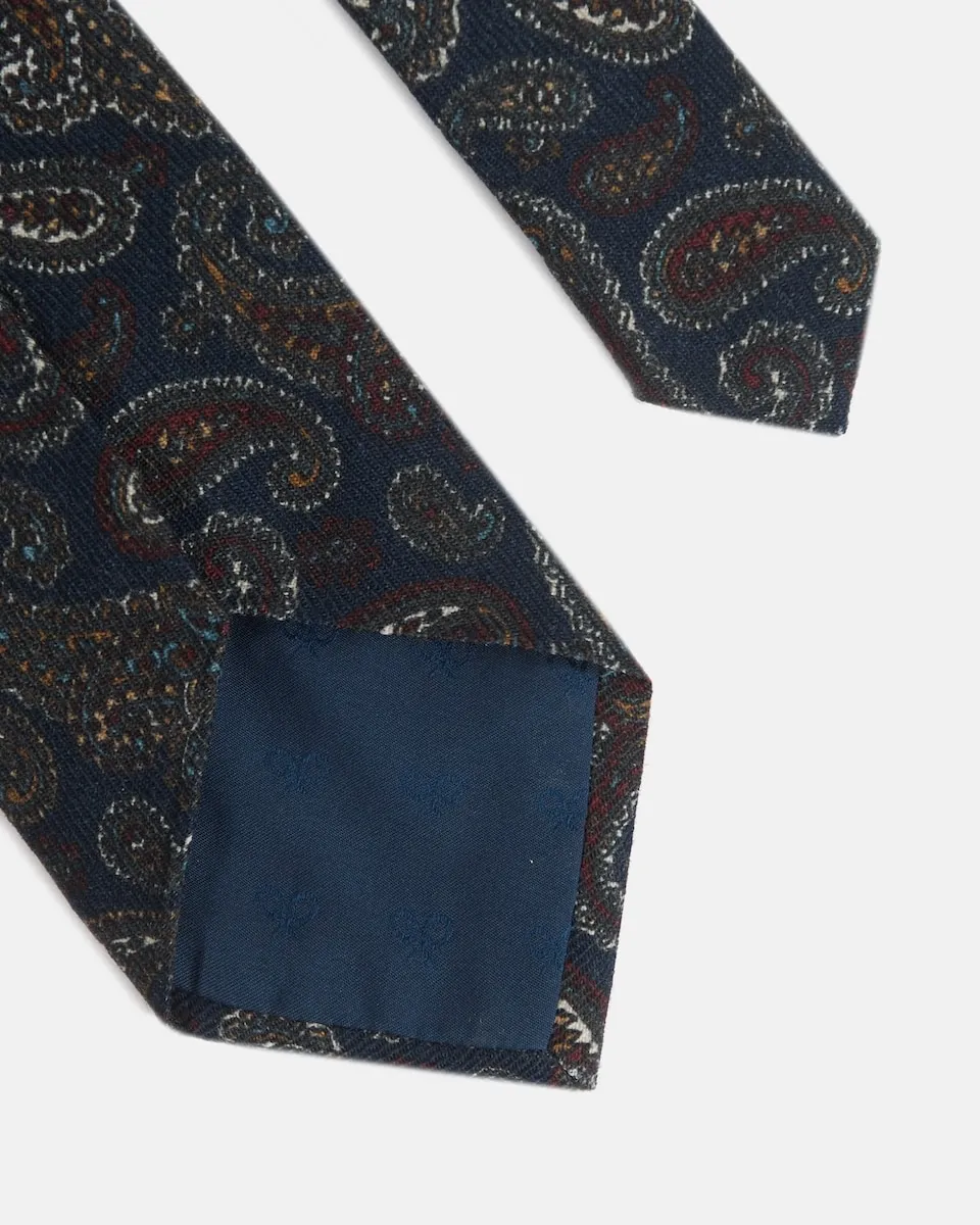 Галстук из кашемира темно-синего цвета, изготовленный из 100% шерсти. Имеет внутреннюю подкладку с индивидуальными узорами. Сделано в Италии.