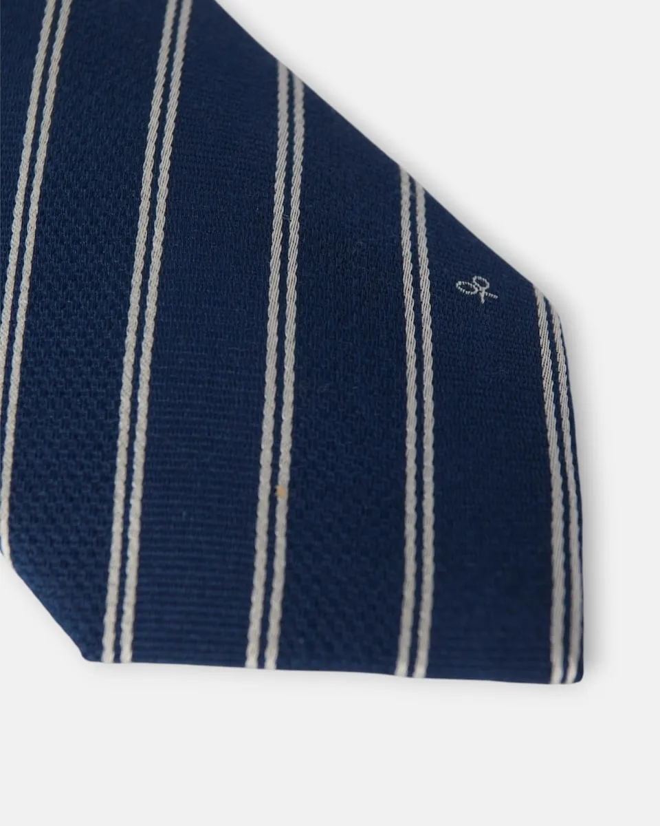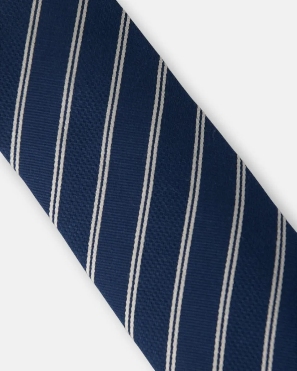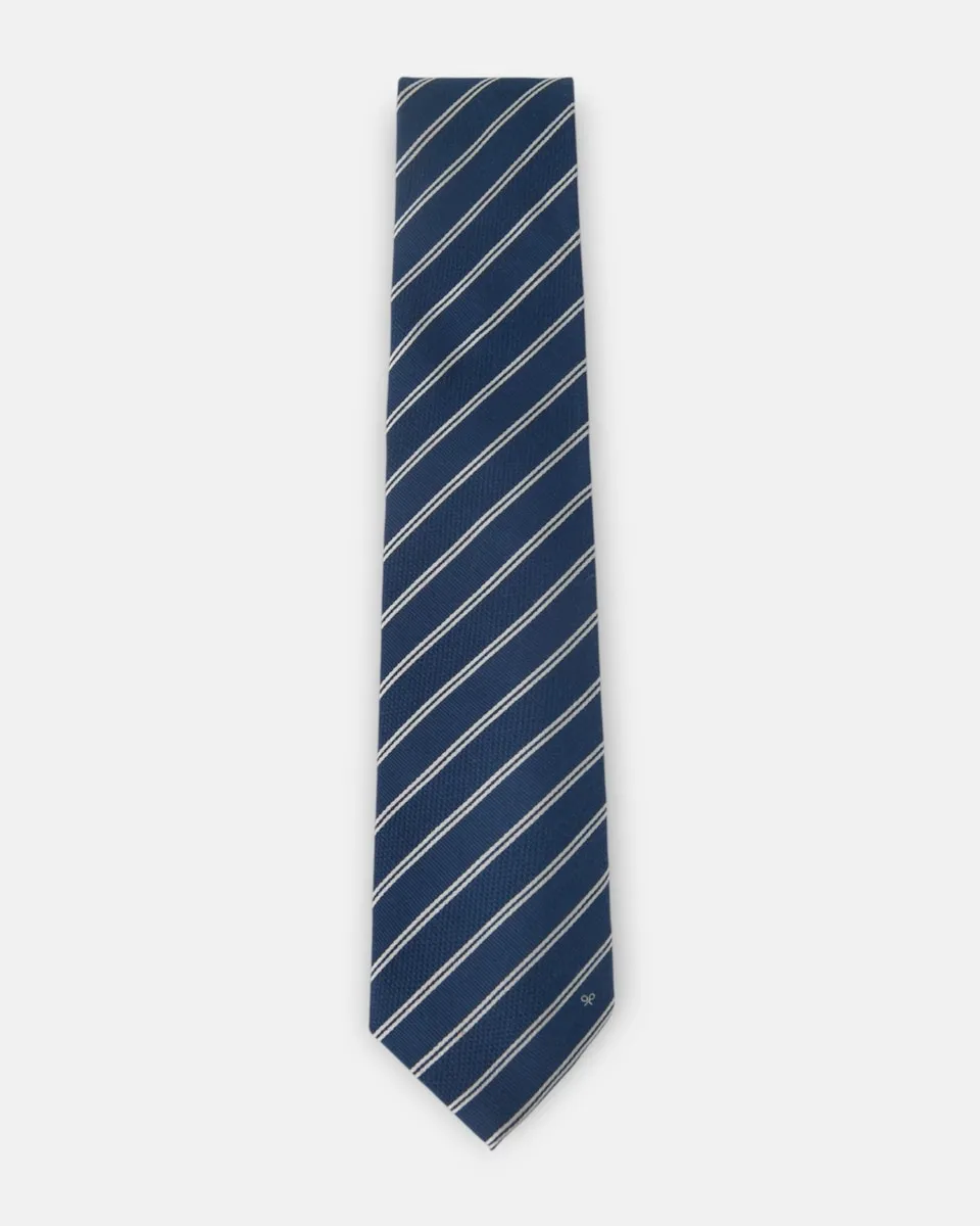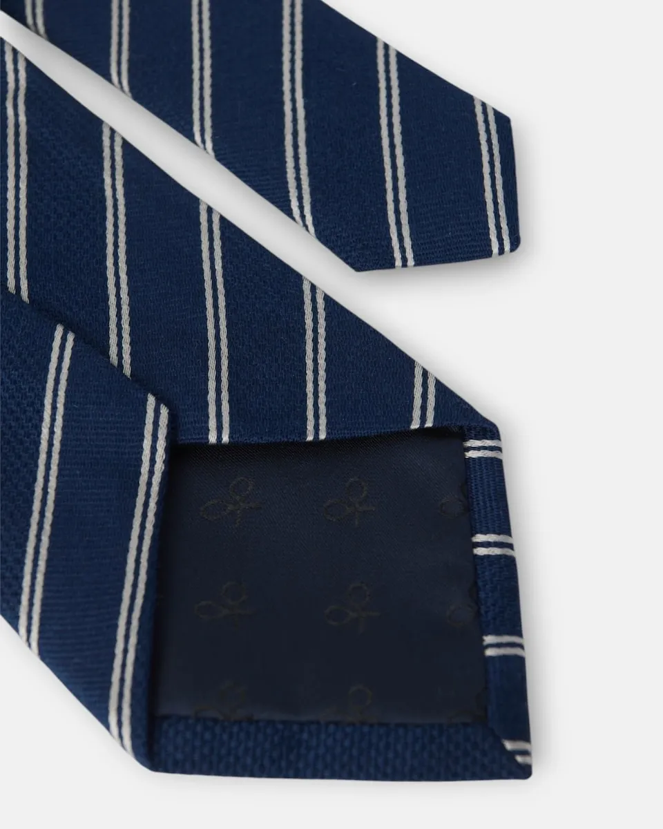 Галстук с двойной диагональной полосой, цвета темно-синего, выполнен из смеси шелка и хлопка. Имеет дизайн с белыми двойными диагональными полосами.