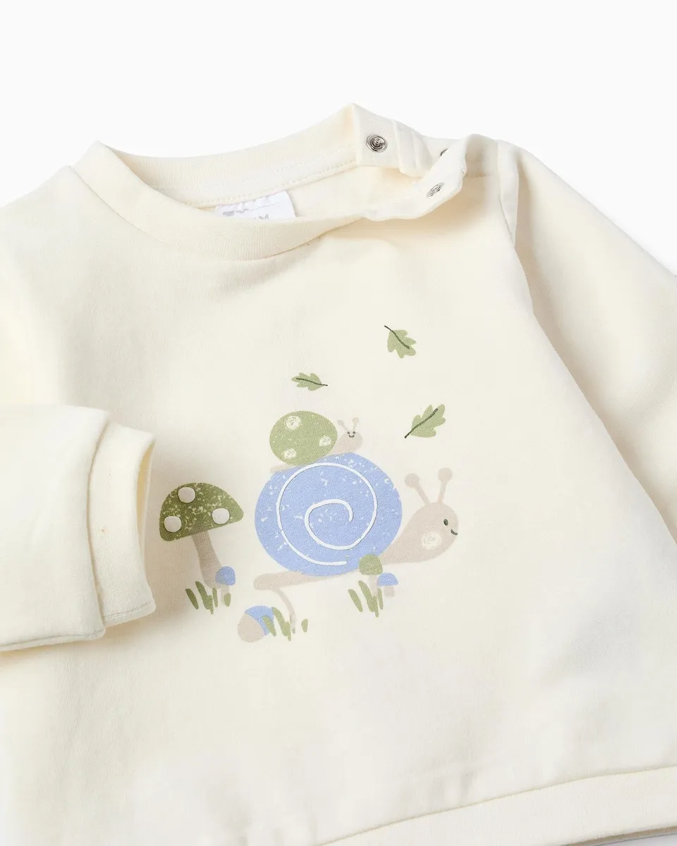 Бежевый свитер с принтом улиток для новорожденных. Внутренняя сторона с ворсом для дополнительного тепла. Кнопки на плече для легкого надевания. Ребристые края для идеальной посадки. Теплая и забавная кофта!