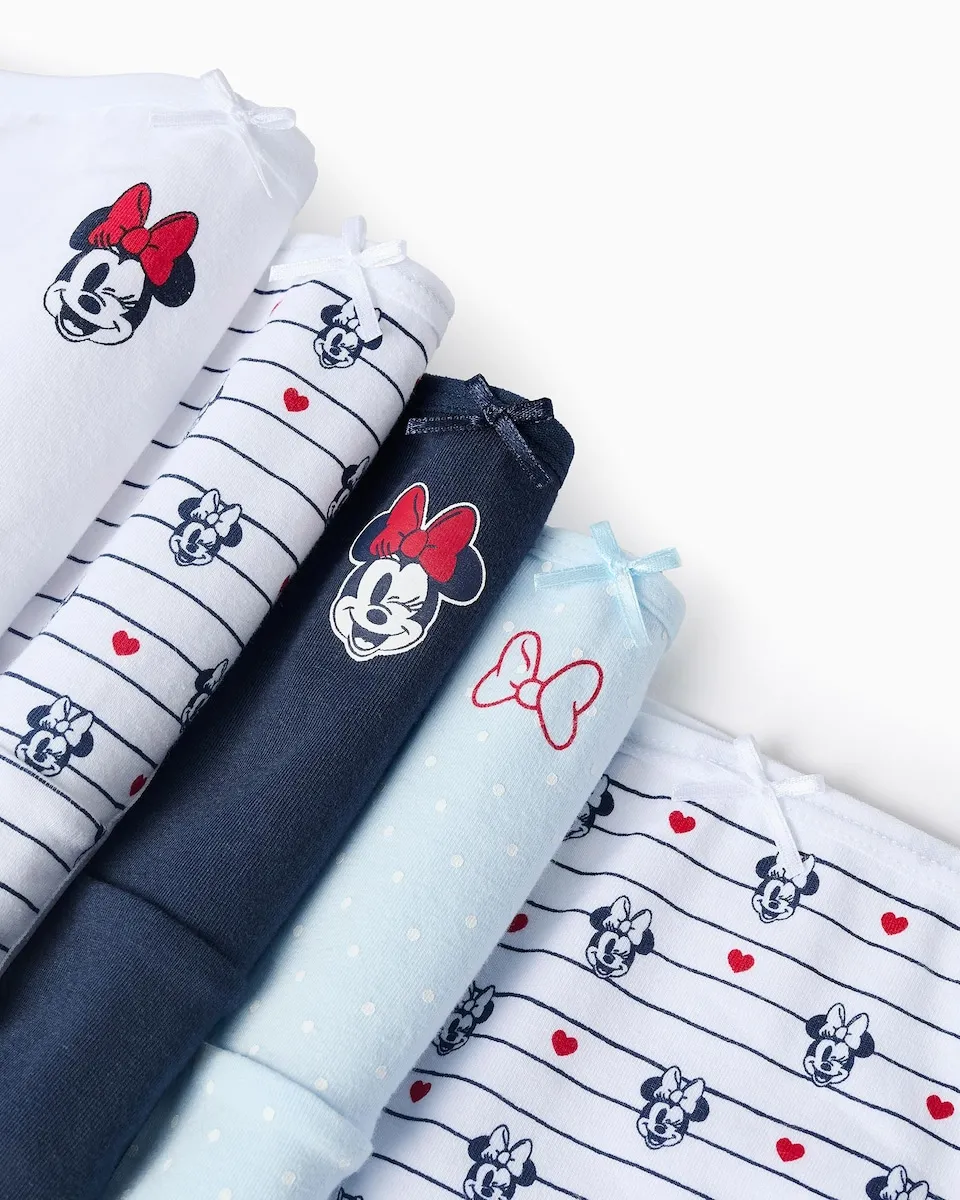 Набор из пяти трусиков для девочек, выполненных из хлопка с добавлением эластана для большей комфортности и свободы движений. В синих и белых тонах, с принтами и мотивами милой Минни. Деталь в виде банта спереди. Идеально подходит для повседневного ношения.