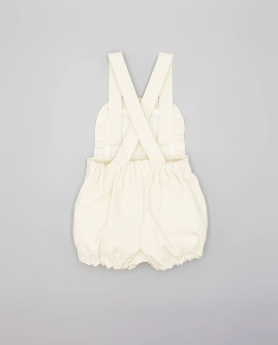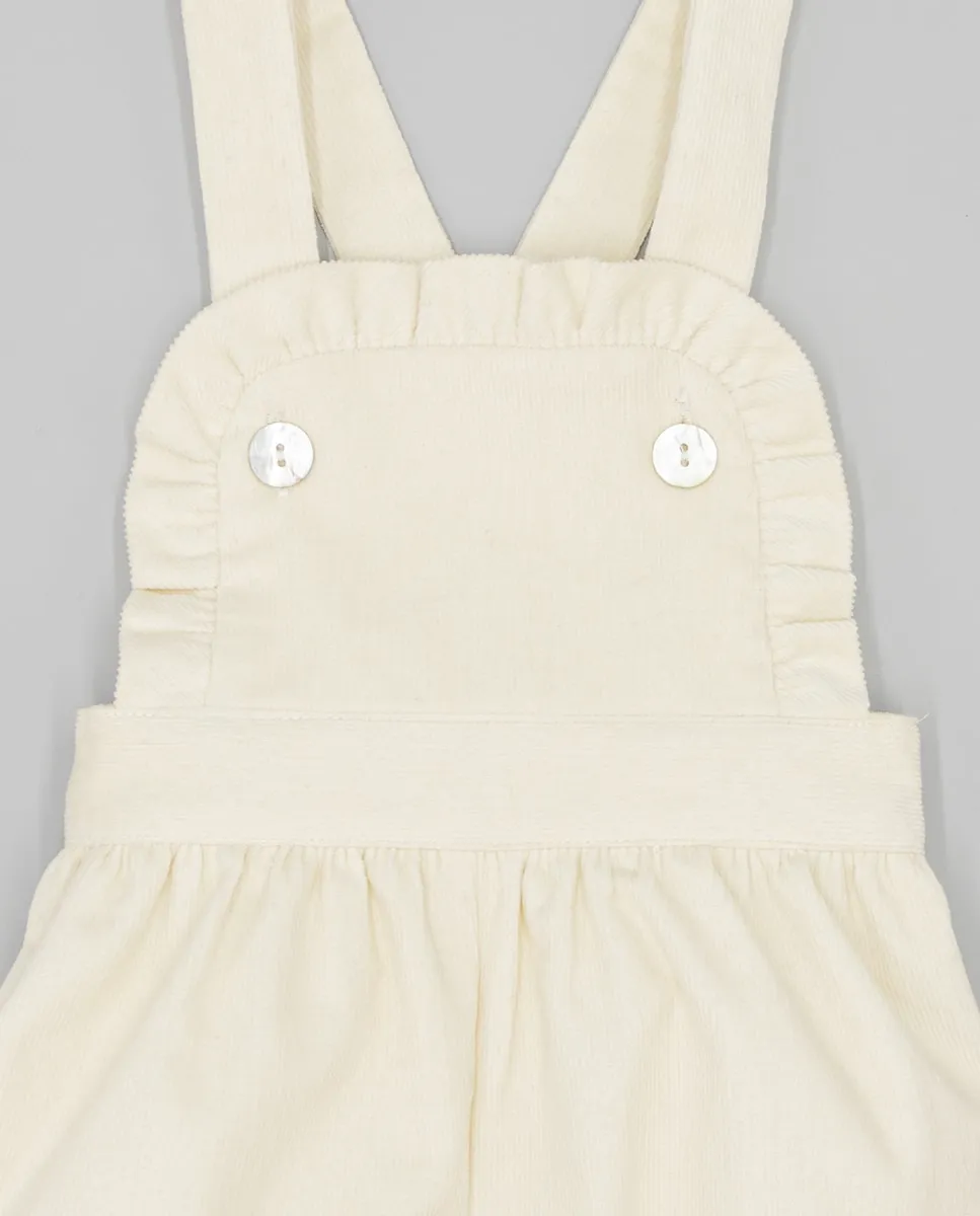 Белый детский комбинезон из вельвета с рюшей спереди. Перекрещивающиеся на спине бретельки с регулируемыми пуговицами из перламутра. Легко присборенная талия. Доступны размеры от 3 месяцев до 4 лет.
