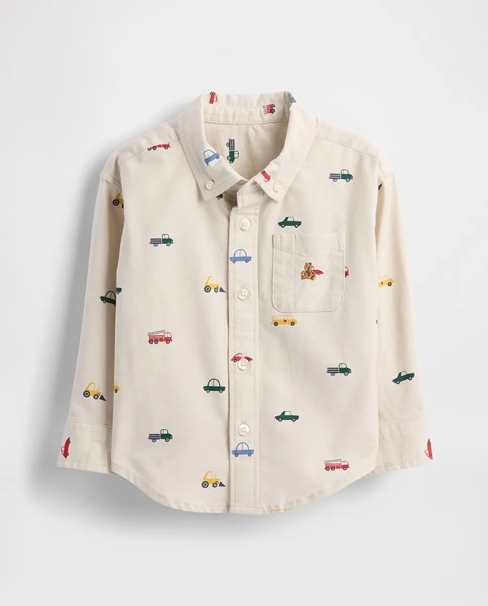 Оксфордская рубашка из эластичного хлопка с мягкой тканью. Воротник на пуговицах. Длинные рукава с манжетами на пуговицах. Застежка спереди на пуговицы. Накладной карман с вышитым медвежонком Бреннаном на груди. Закругленный подол. Некоторые стили имеют полный принт. Сделано из 98% хлопка в процессе конверсии. Этот продукт поддерживает фермеров, которые переходят на трехлетний период к сертифицированным органическим методам ведения сельского хозяйства, без использования пестицидов и синтетических удобрений. Этот продукт был изготовлен на фабрике, которая инвестирует в гендерное равенство и расширение прав и возможностей женщин через программу RISE. Узнайте больше на gapinc.com/equity.