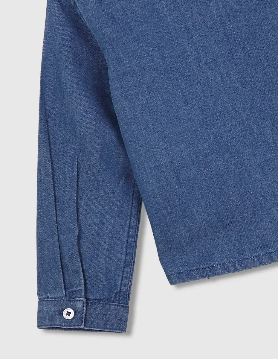 Джинсовая рубашка с длинными рукавами, заканчивающимися манжетами на пуговицах, с застежкой спереди и воротником «бэби».