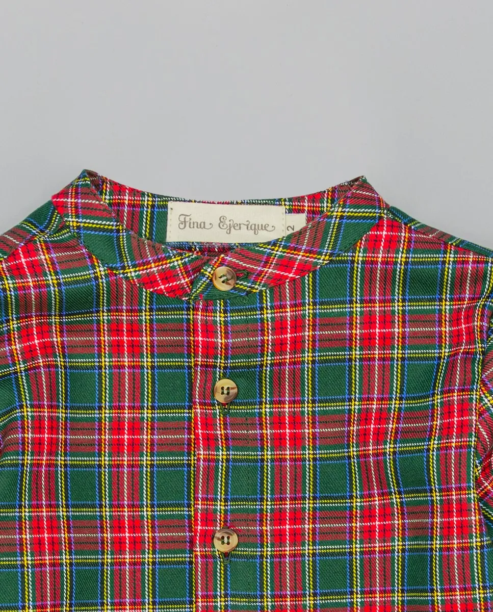 Вельветовая рубашка в клетку с зелеными, красными, желтыми и синими цветами и стойкой. Пуговицы из смолы естественного тона и манжеты на пуговицах. 100% хлопок, мягкая и комфортная. Доступна в размерах от 3 месяцев до 12 лет.