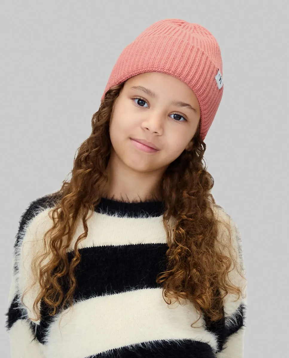 Детская вязаная шапка, выполненная из 100% акрила, с ребристой вязкой и логотипом CK.