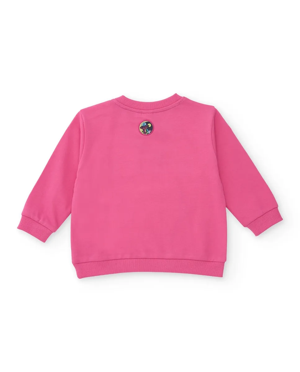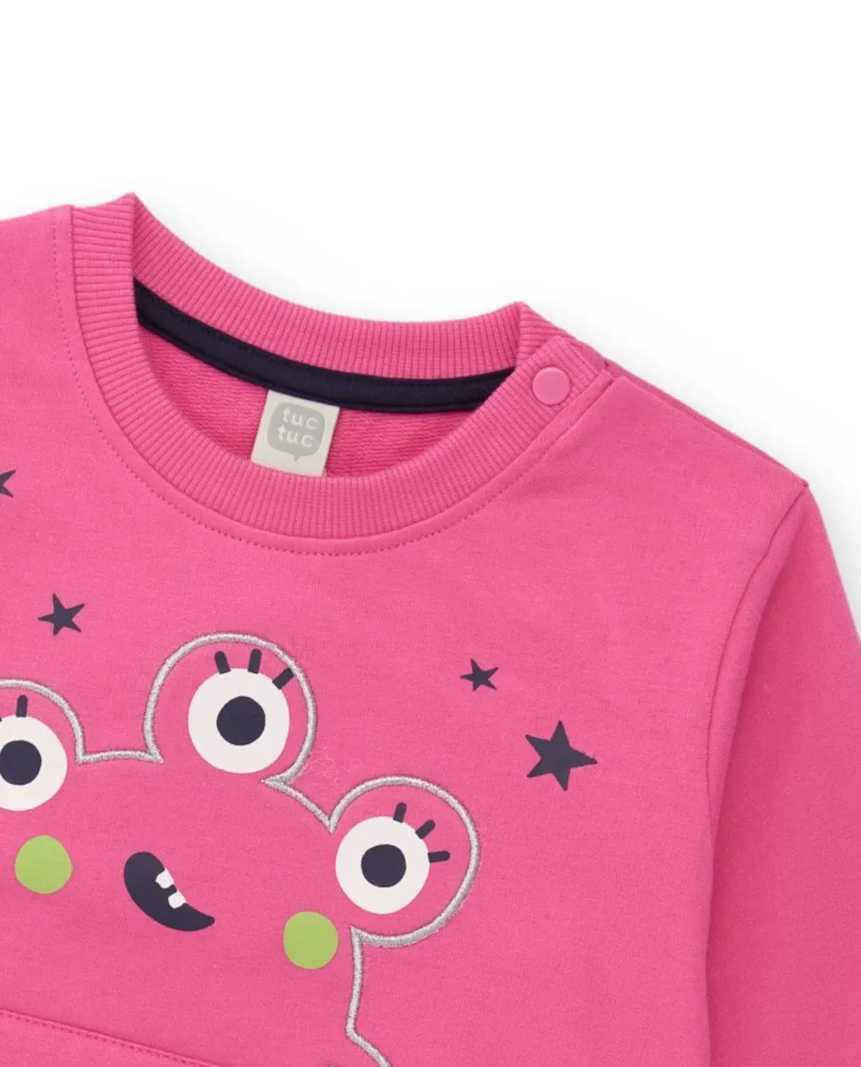 Свитшот для девочки с длинными рукавами розового цвета, выполненный из мягкой трикотажной ткани. На нем забавный принт с монстром с несколькими глазами и деталями в виде звезд на груди, а также кенгуровский карман спереди. Дизайн включает вышитые детали и аппликации, выступающие по низу, имитируя лапы монстра. Имеется круглый вырез, ребристые манжеты и низ, а также кнопка на плече для удобства при переодевании. Идеально подходит для создания оригинального и веселого образа.
