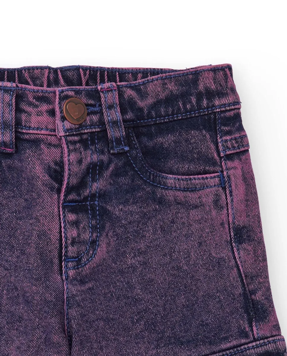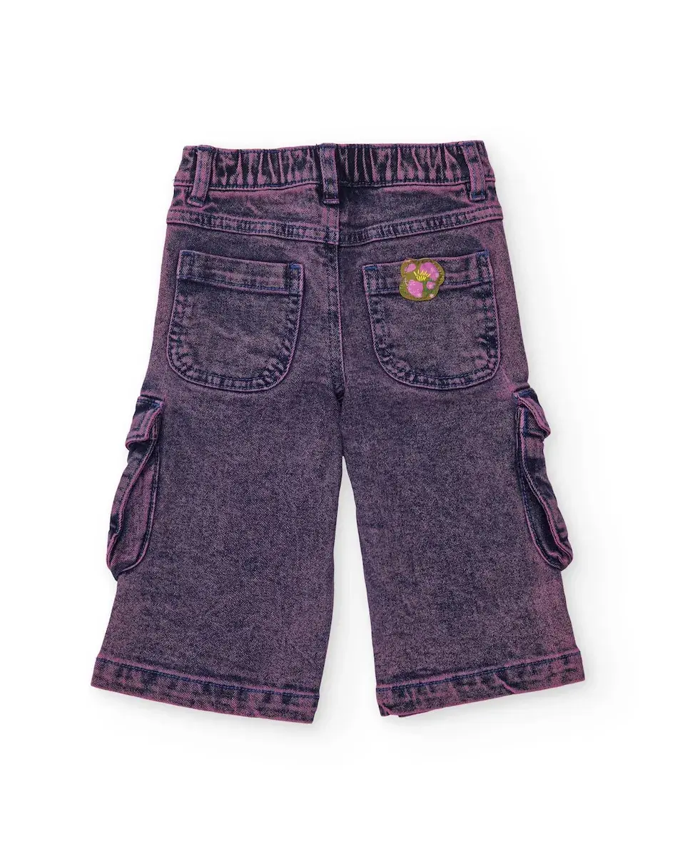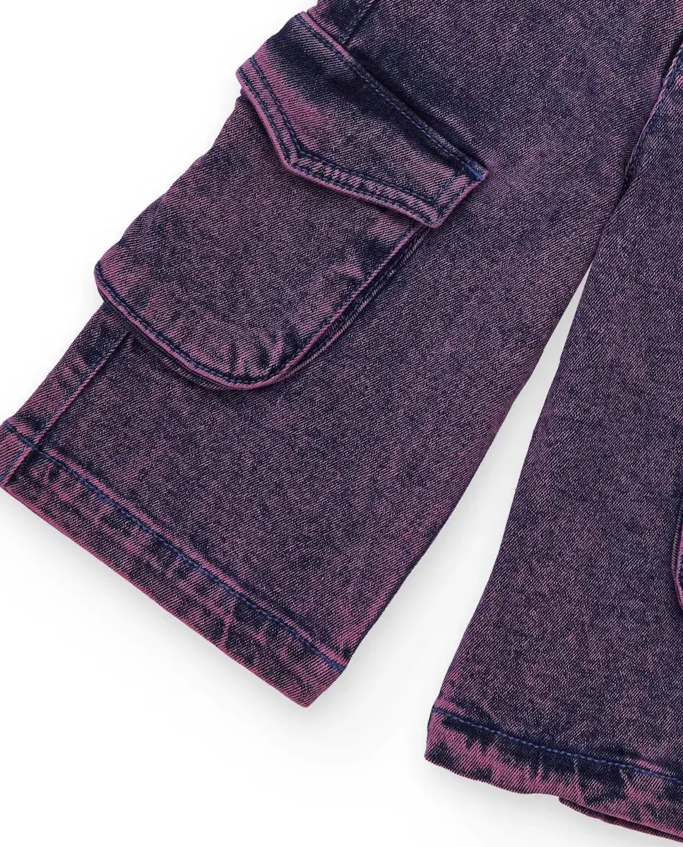 Джинсовые брюки-карго для девочки, выполненные из денима с фиолетовой окраской и эффектом потертости. Модель практичная, с боковыми карманами с клапанами, а также с передними и задними карманами. Пояс частично эластичный для большего комфорта и идеальной посадки. Современная и универсальная одежда, идеально подходящая для повседневной носки с городским и оригинальным стилем.