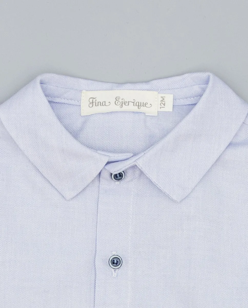 Голубая оксфордская рубашка с отложным воротником. Пуговицы из уретана с контрастным синим цветом. 100% хлопок, мягкая и прочная. Доступны размеры от 3 месяцев до 14 лет.