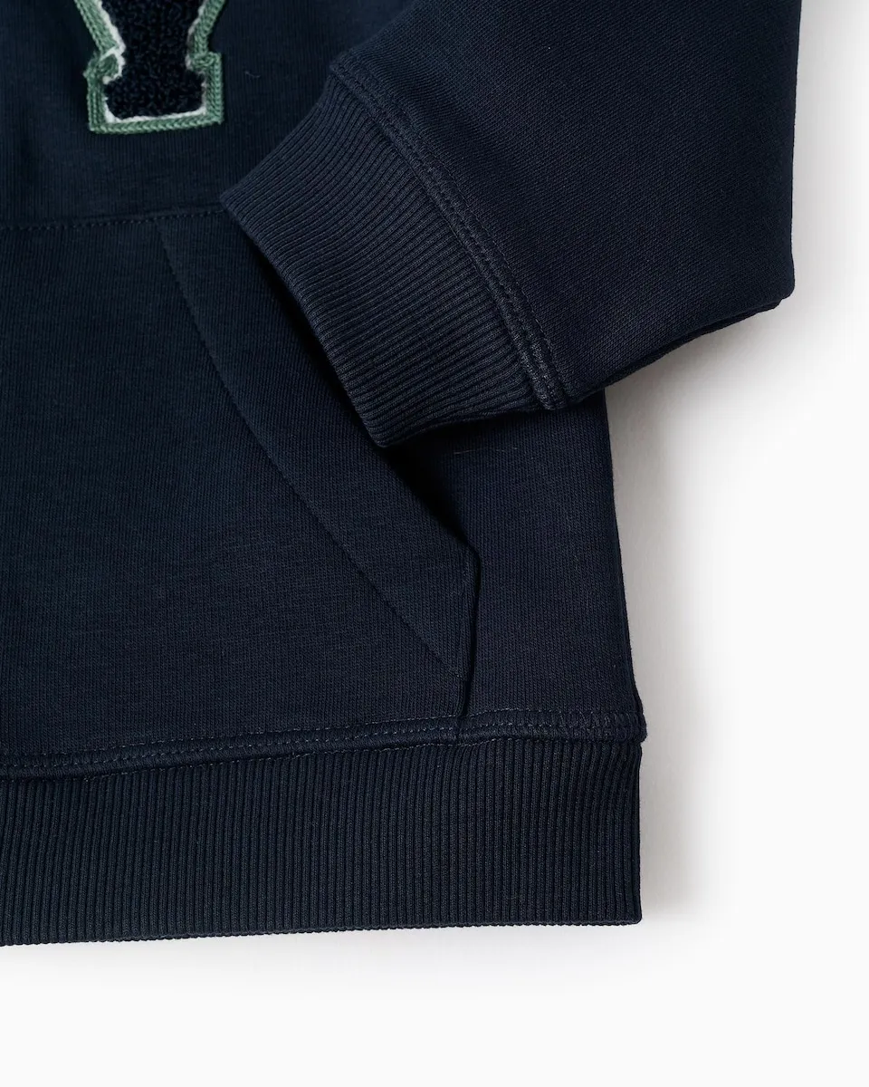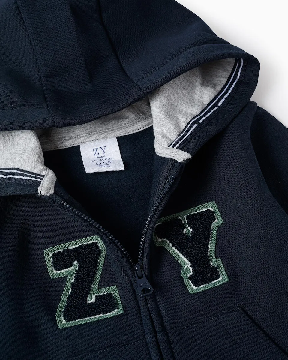Темно-синяя плюшевая куртка для маленького мальчика, с внутренней частичной подкладкой для лучшего тепла. Капюшон с серой трикотажной подкладкой. Буквы ZY с зеленой окантовкой, объемные на груди, из букле. Карманы кенгуру. Ребристые края для идеальной посадки. Практичная и уютная.