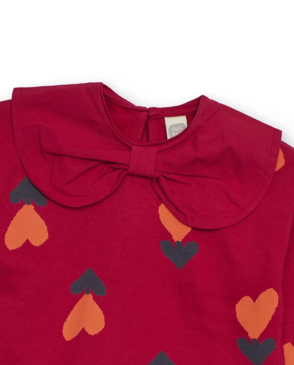 Красный свитшот для девочки с сердечками и воротником с бантом Tuc tuc