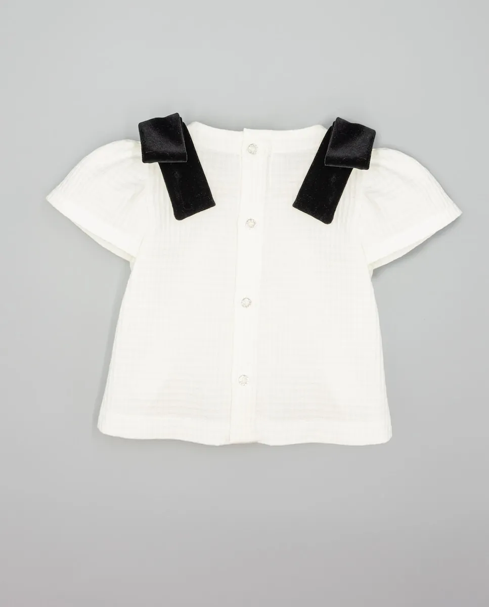 Белая рубашка для девочки из фактурной ткани с декоративными черными бархатными бантиками на плечах. Вырез «лодочка». Сборки на коротких рукавах. Застежка на спинке с перламутровыми пуговицами. Доступна в размерах от 2 до 16 лет.
