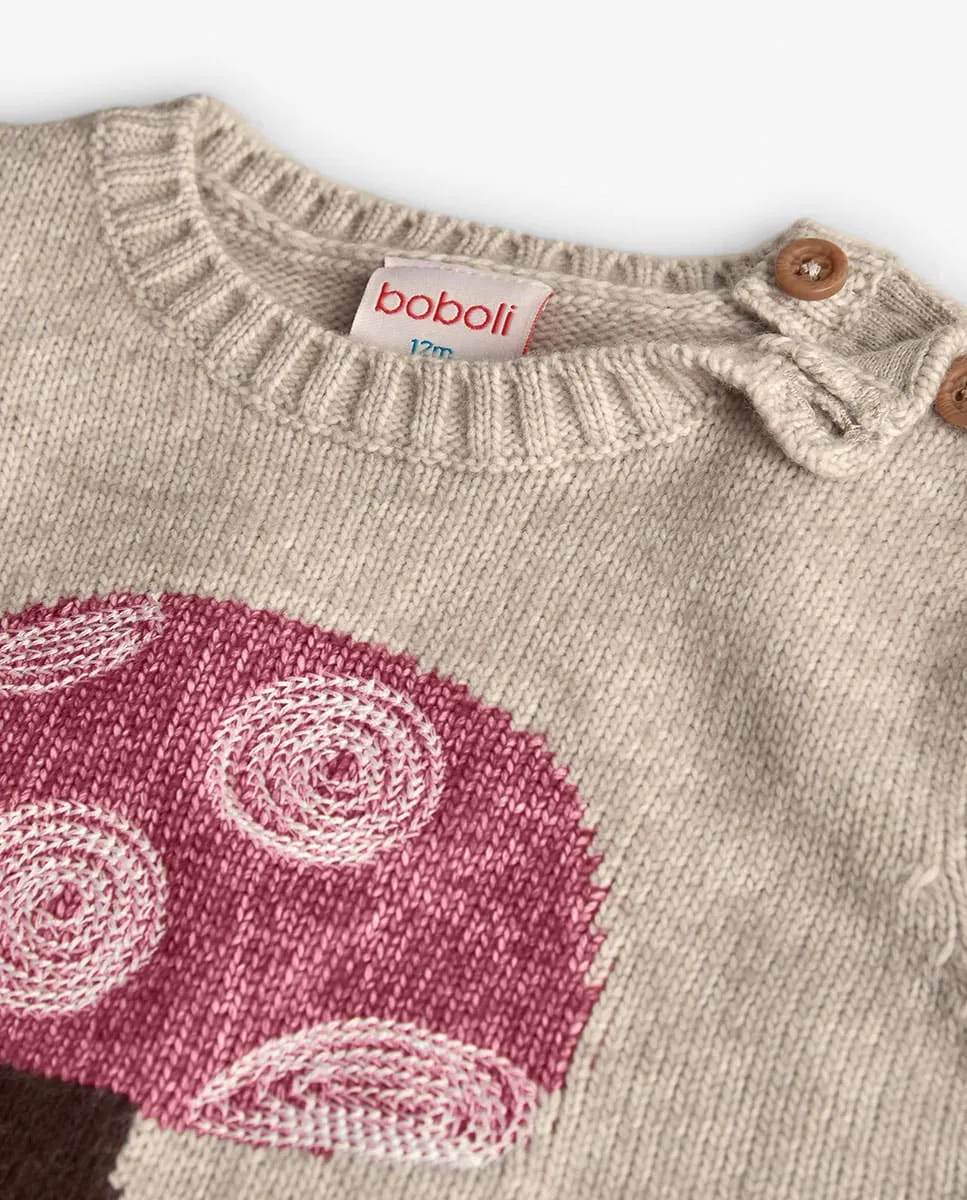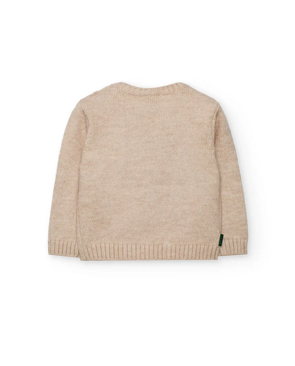 Вязаный джемпер бежевого цвета, идеально подходящий для осенне-зимнего сезона. Изготовлен из мягкой ткани, обеспечивающей тепло и комфорт, он идеально подходит для самых холодных дней. Дизайн включает круглый вырез и длинные рукава, обеспечивая удобную и уютную посадку. Бежевый цвет облегчает сочетание с юбками, брюками и леггинсами. Доступен в размерах от 12 месяцев до 10 лет, эта вещь является необходимостью для добавления элегантности и очарования в детский гардероб.