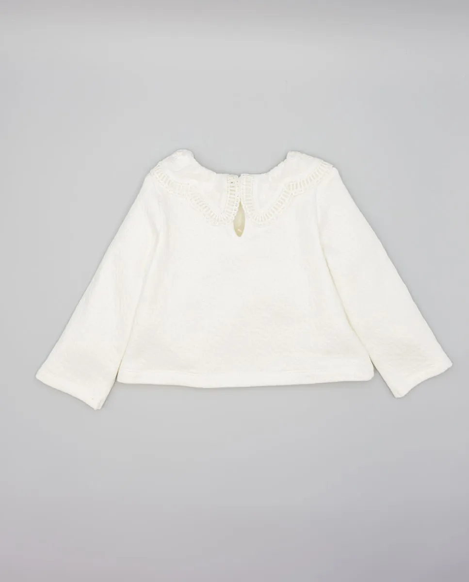 Бежевый текстурированный трикотажный джемпер с воротником из 100% хлопка, украшенный вышивкой и ажурными вставками. Мягкая и удобная ткань, доступен в размерах от 2 до 16 лет.