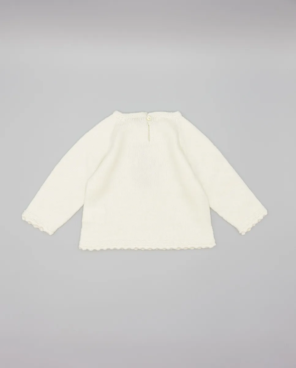 Белый вязаный детский джемпер с изображением оленя спереди и бархатным бантиком. Отделка маленькими помпонами на подоле и манжетах. Мягкая и теплая ткань, идеальна для холодных дней. Доступен в размерах от 1 месяца до 4 лет.