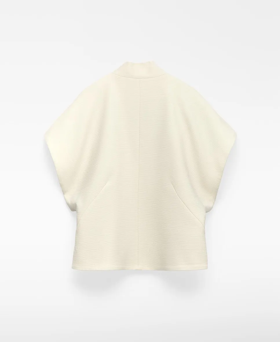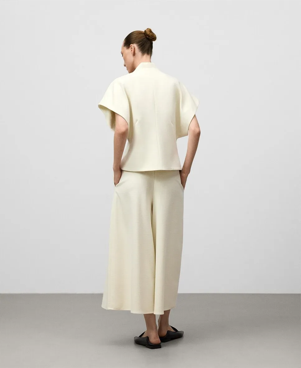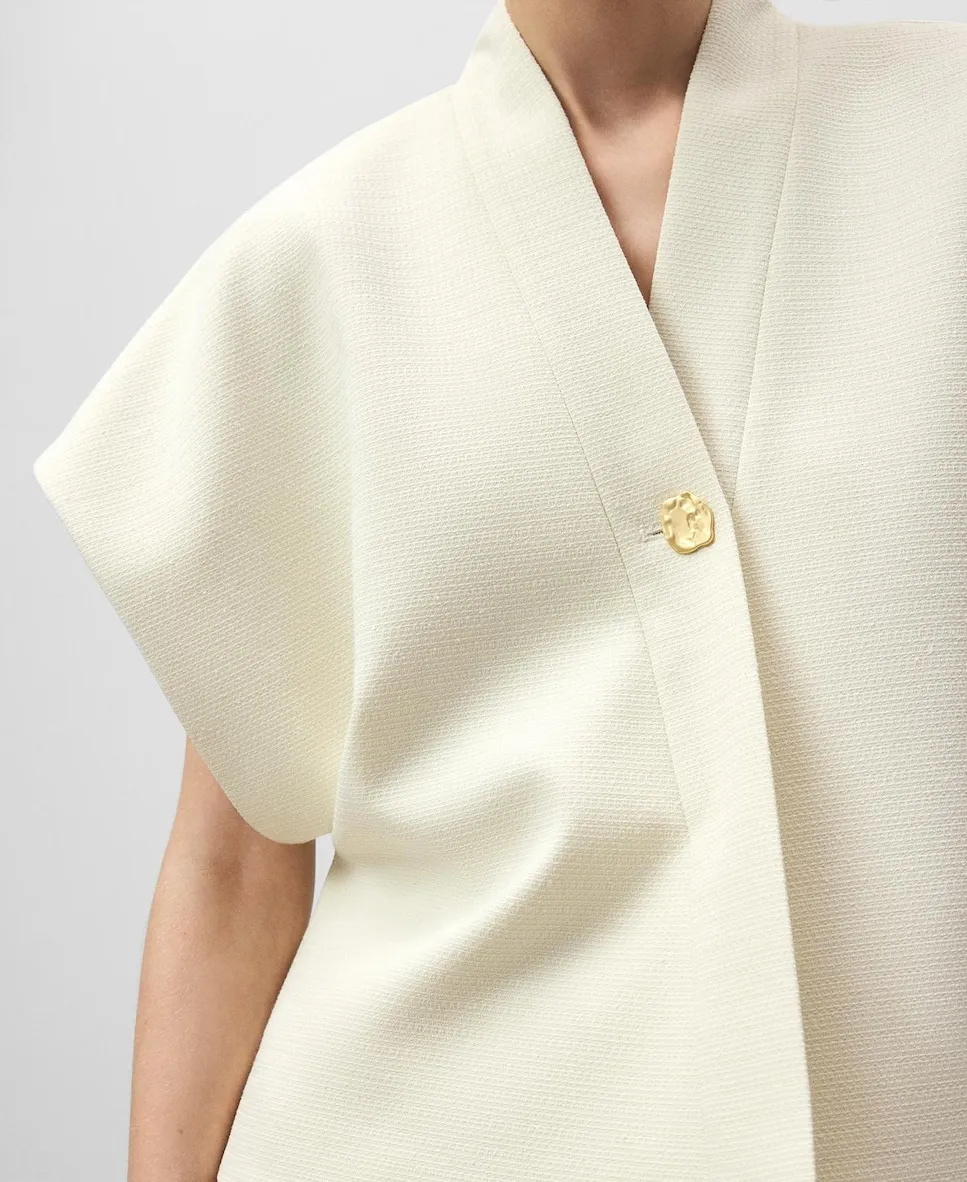 Топ с перекрестной текстурой. Имеет V-образный вырез с декоративной застежкой на пуговицу и короткий японский рукав.