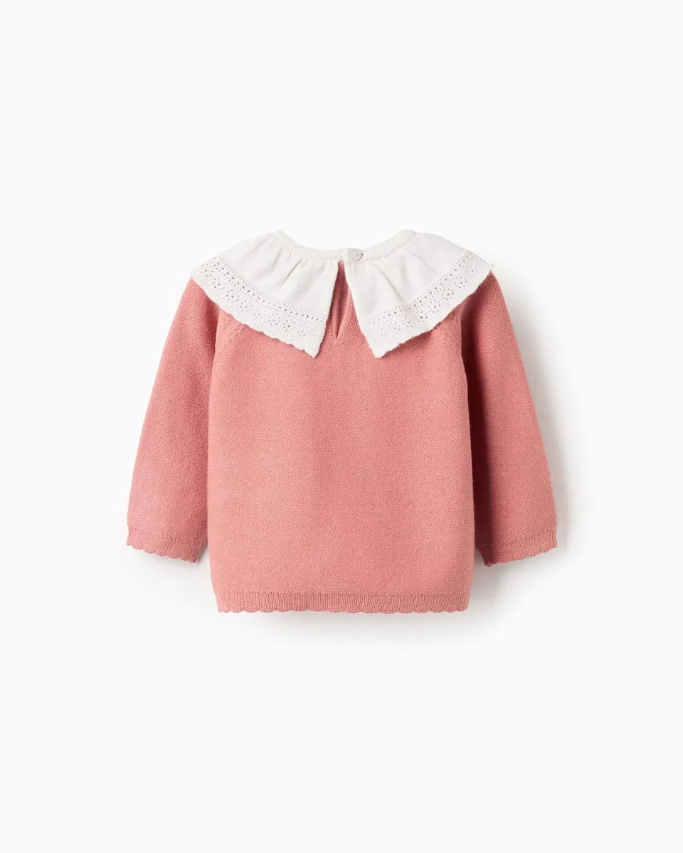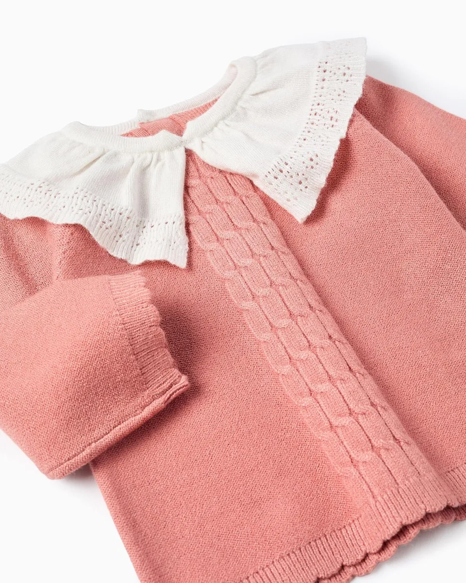 Розовый вязаный свитер для новорожденной с плетеным узором по центру. Большой белый воротник с вышивкой. Волнистые края для элегантного вида.