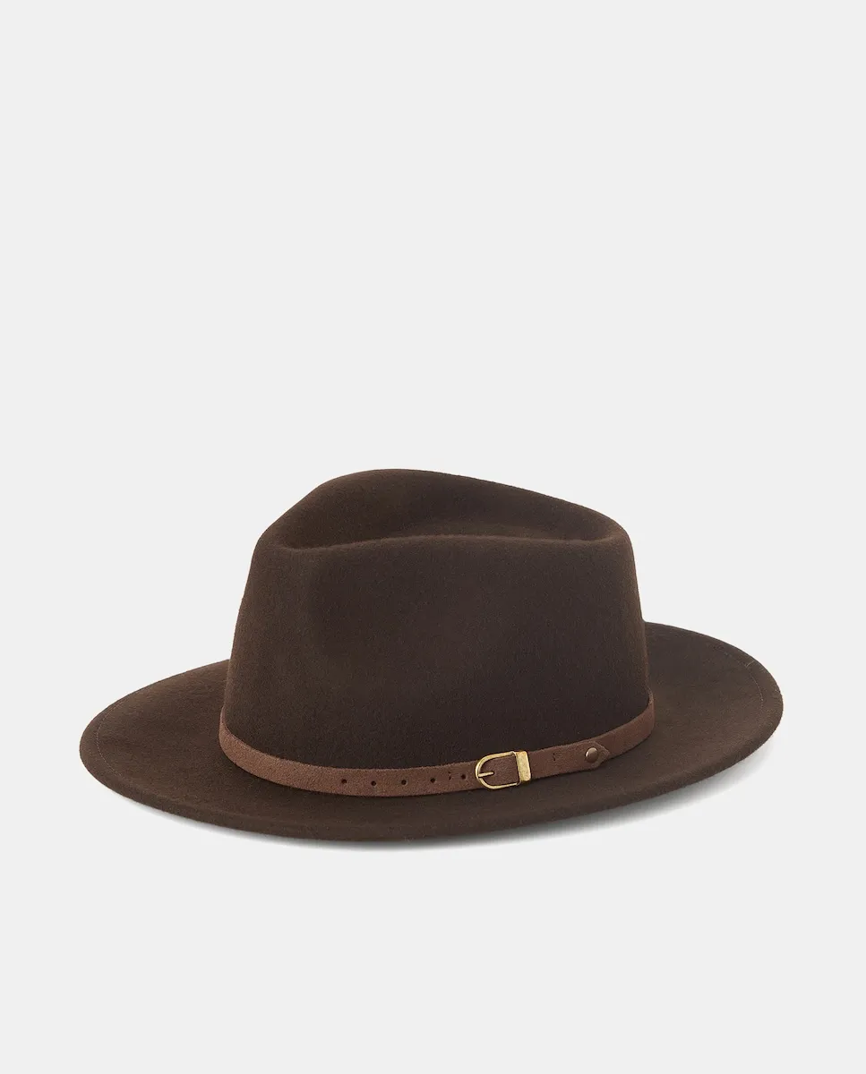 Шляпа с кожаным ремешком из замши и золотой пряжкой.