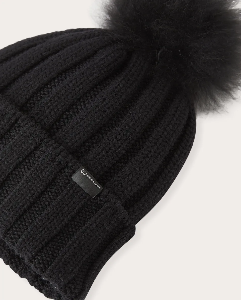 Шапка-бини из шерсти в рубчик с помпоном.