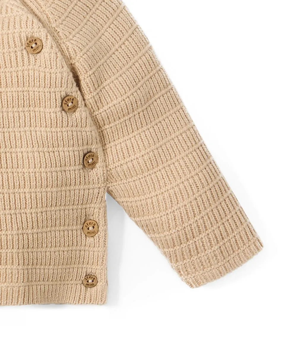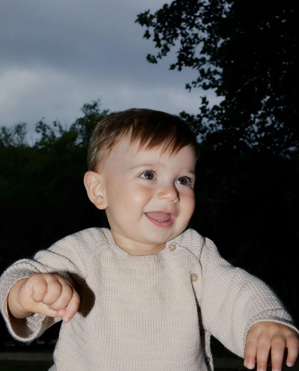 Вязаный свитер с круглым вырезом и длинными рукавами. Передняя застежка на пуговицы. Ткань из смеси хлопка.