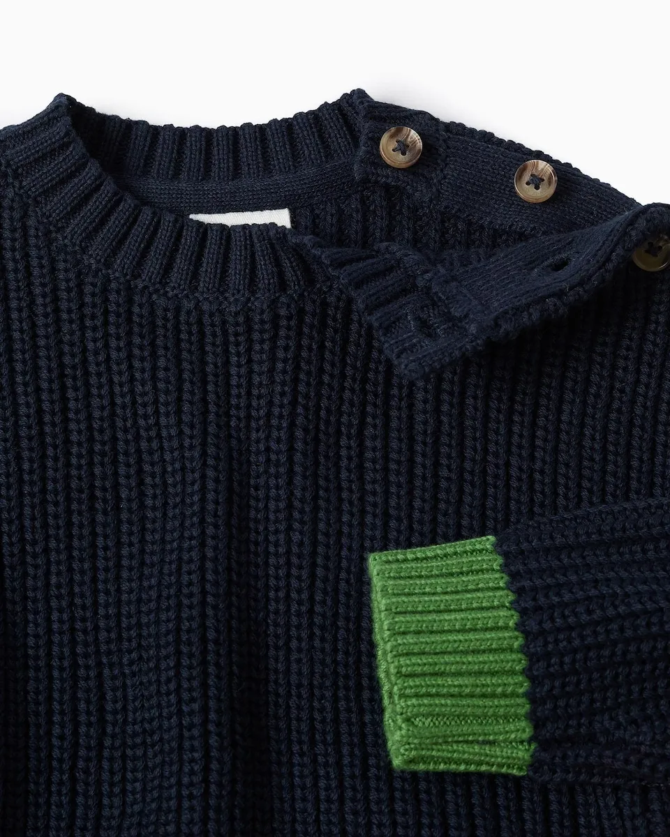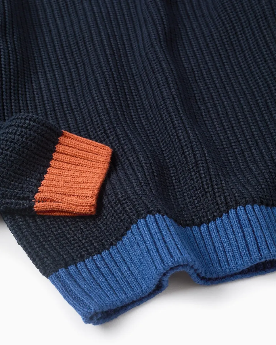 Темно-синий вязаный джемпер для мальчика, 100% хлопок. Пуговицы на плече для легкого надевания. Ребристые края разных цветов. Мягкий, удобный и оригинальный!