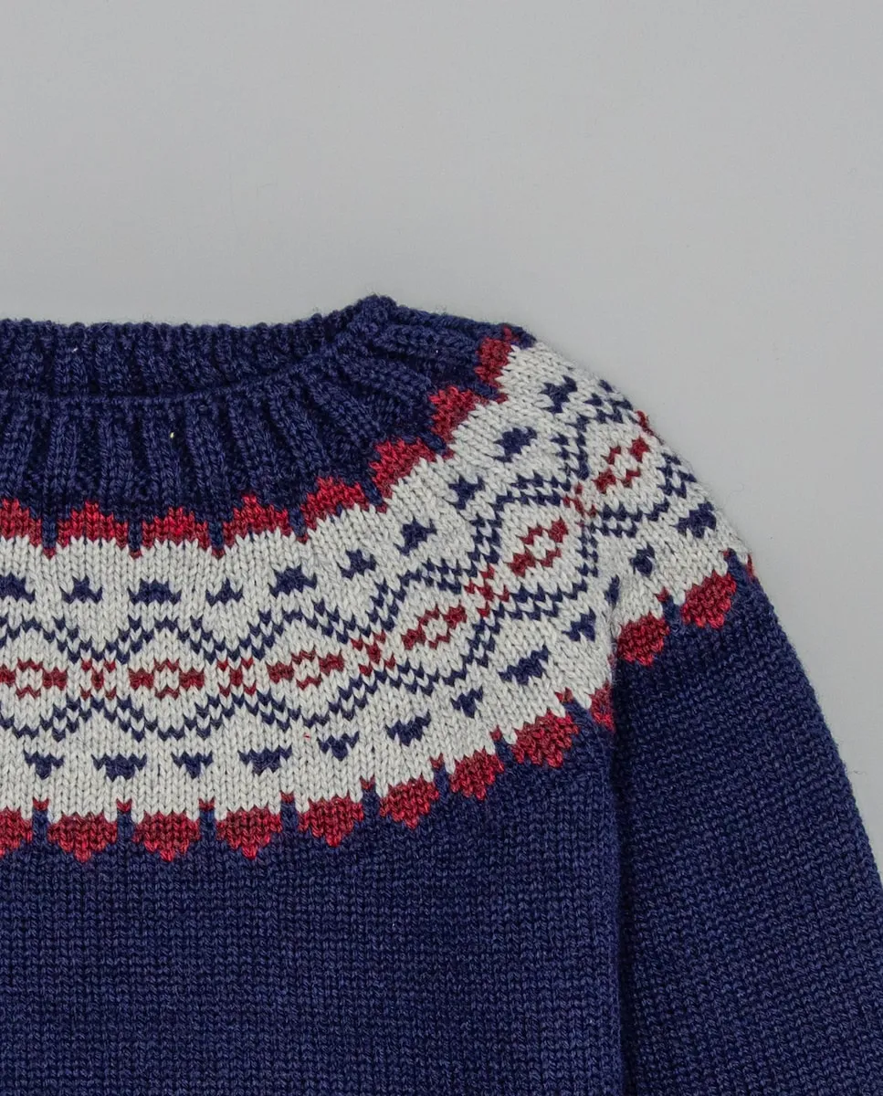 Свитер темно-синего цвета с узором в кремовых и бордовых тонах. Выполнен бесшовным способом для большего комфорта. Отделка горловины, манжет и низа выполнена в рубчик. Идеально подходит для холодных дней. Доступен в размерах от 3 месяцев до 12 лет.