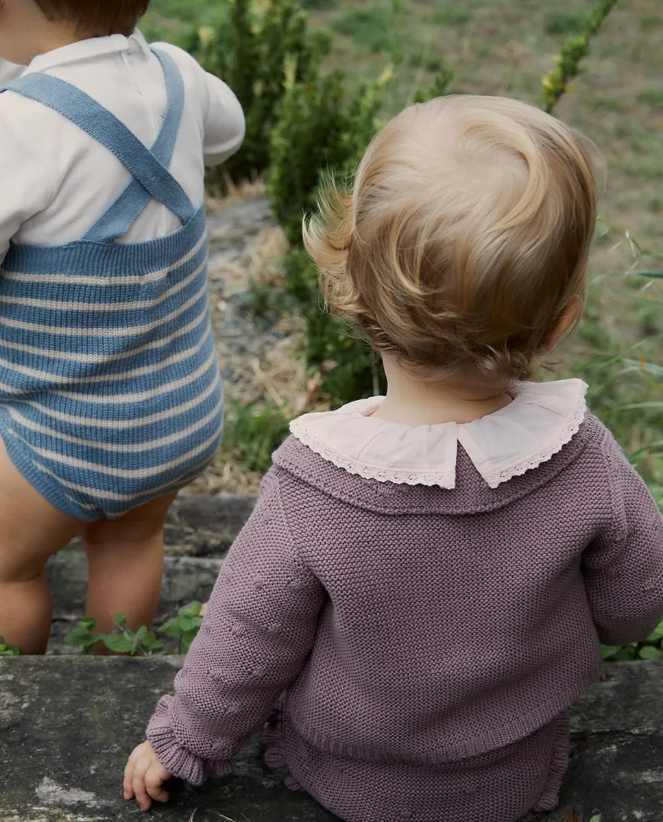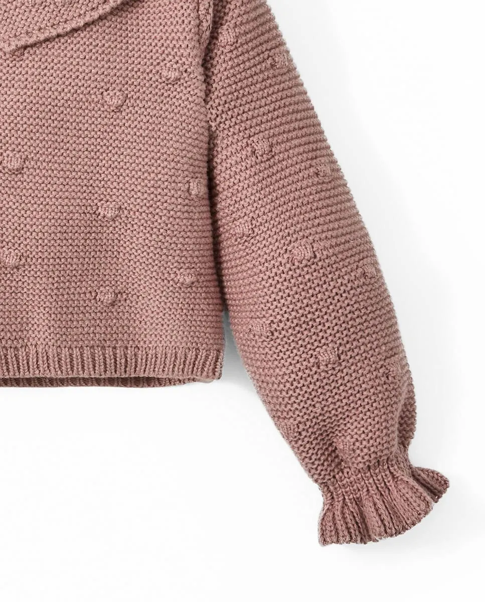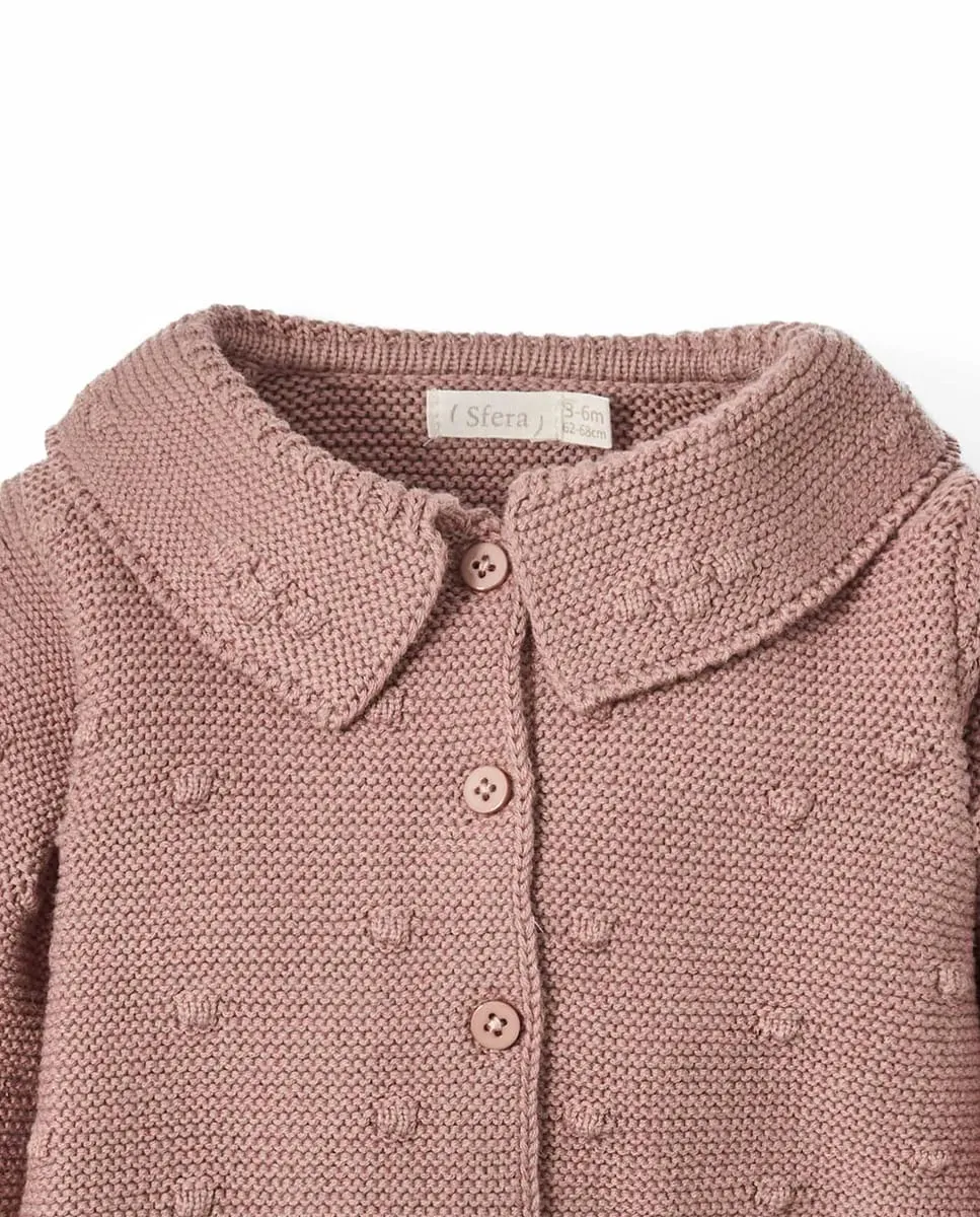 Вязаная куртка с воротником-рубашкой и длинными рукавами с эластичными манжетами. Застежка на пуговицы спереди. Ткань: 100% хлопок