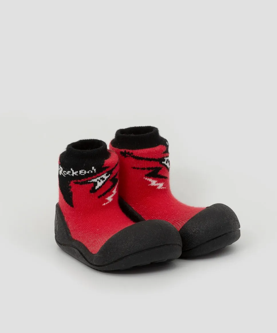 Красные хлопковые пинетки с рисунком электрогитары. Эффект носка с эластичной тесьмой на голенище. Разработаны для помощи когнитивному развитию, обеспечивая равновесие и стабильность ножек малыша. Помогают легче учиться ходить. Гибкая и противоскользящая подошва. Легко стираются и быстро сохнут.