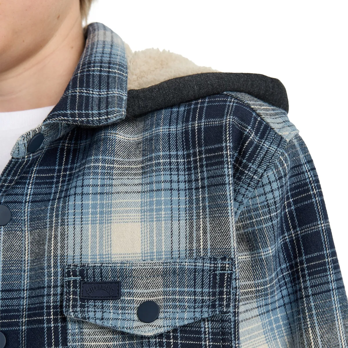 Флисовая рубашка для детей 8-16 лет. Особенности включают: Материал: покрытие DWR, Капюшон с шнурками и подкладкой из шерпы, Передняя застежка на кнопки, Карманы для рук и карман на груди.