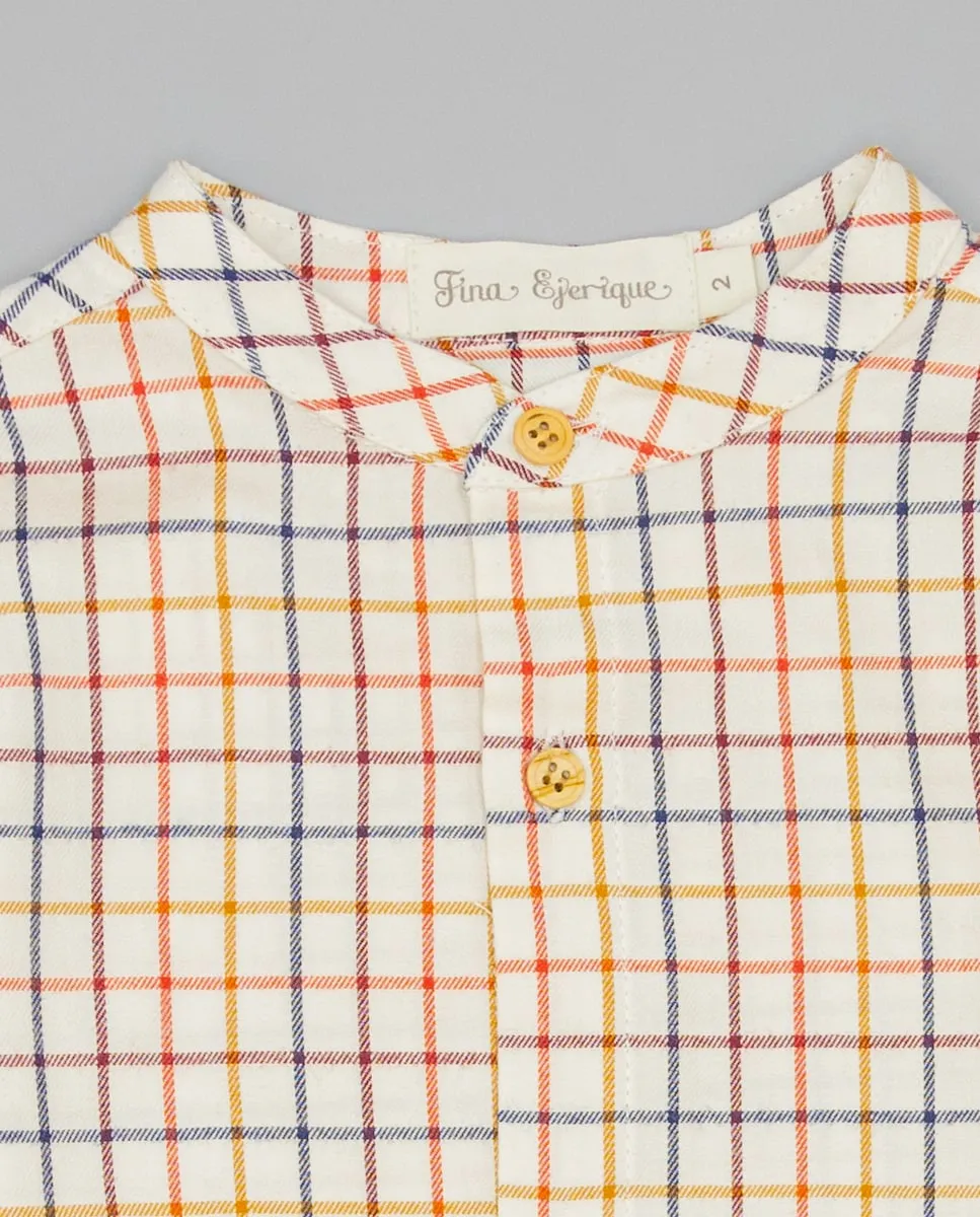 Бежевая рубашка из вельвета в клетку горчичного, зеленого и бордового цветов с воротником-стойкой. Деревянные пуговицы и манжеты на пуговицах. 100% хлопок, мягкая и удобная. Доступна в размерах от 3 месяцев до 12 лет.