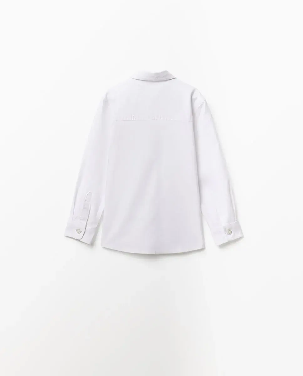 Рубашка с классическим воротником и длинными рукавами, заканчивающимися манжетами на пуговицы. Застежка на пуговицы спереди. Ткань 100% хлопок.