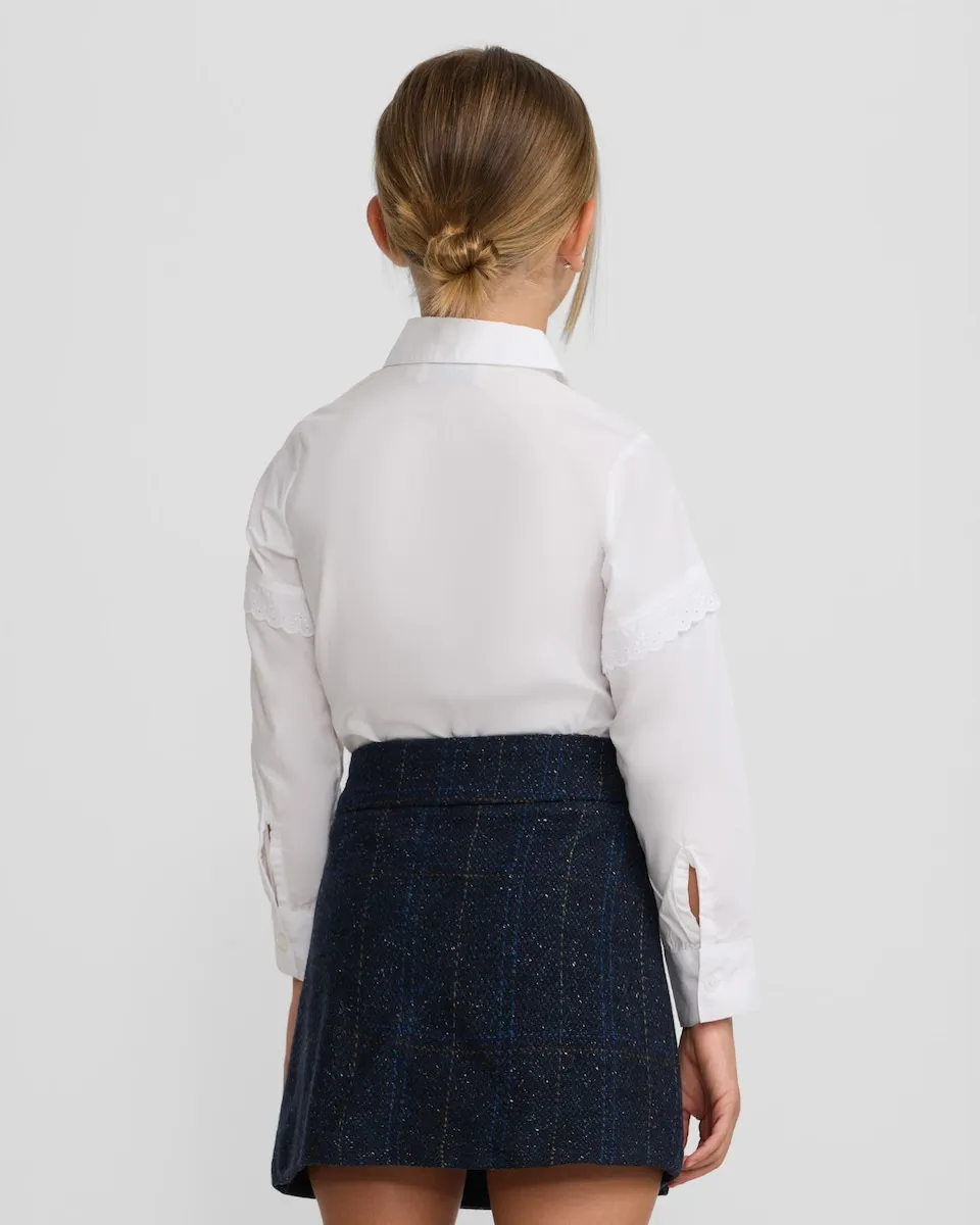 Рубашка для девочек с белой вышивкой, выполненная из 100% хлопка, с прямым кроем. Имеет классический рубашечный воротник с планкой на скрытые пуговицы. Оснащена прямым рукавом с рубашечным манжетом на пуговицах. Изготовлена в Португалии.