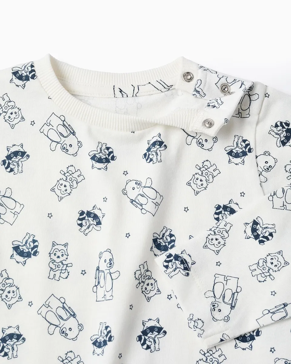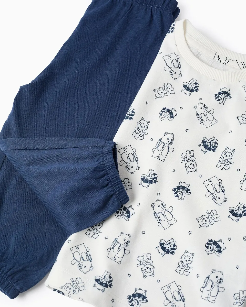 Хлопковая пижама для маленького мальчика в белых и темно-синих тонах. 100% хлопок. В комплект входят длинная футболка с изображением енотов и других лесных животных, а также брюки с эластичными манжетами для идеальной посадки. Внутренние ярлыки нанесены печатным способом, чтобы не раздражать кожу. Мягкая и веселая пижама!